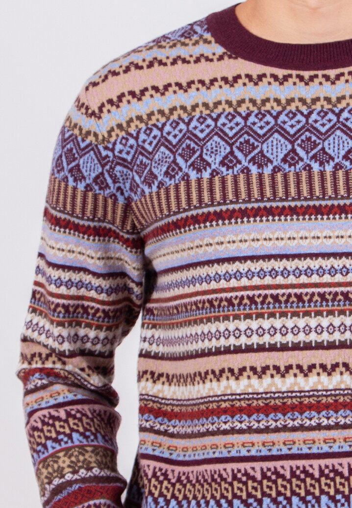 The Fair Isle men’s sweater is knitted from 100% wool and features a distinctive Fair Isle motif that clearly defines the appearance of the article. This men’s wool sweater has a round neckline and long sleeves, finished with a clean, classic fit. Th