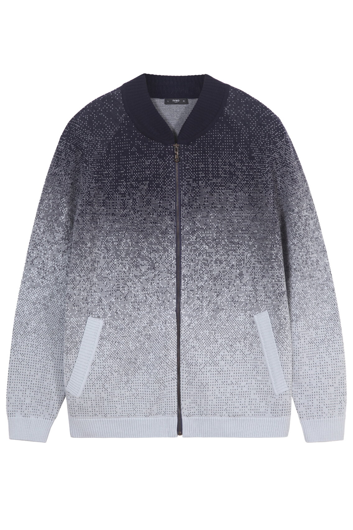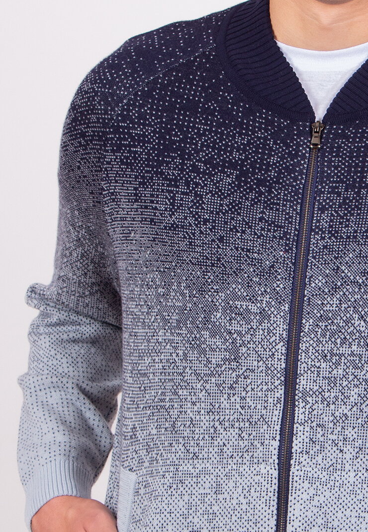 The men’s zip jacket with Murmuration motif is knitted from a wool blend. The dynamic arrangement of the motif creates a strong visual rhythm, while the full-length zip fastening and long sleeves maintain a functional, wearable form.