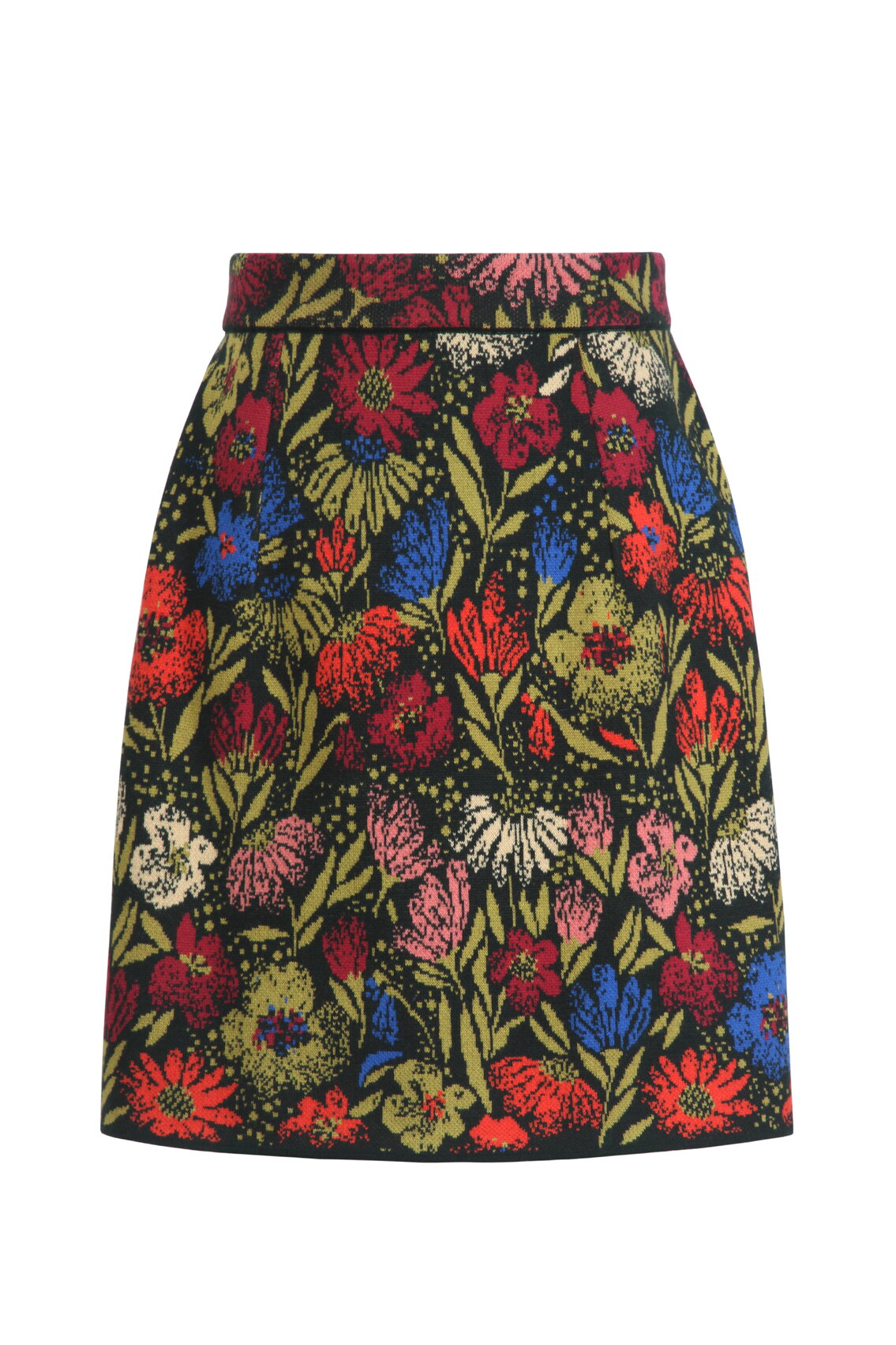 Der A-Linien-Rock aus Baumwolljacquard hat ein Blumenmuster und betont die Taille. Es fällt knapp über das Knie.