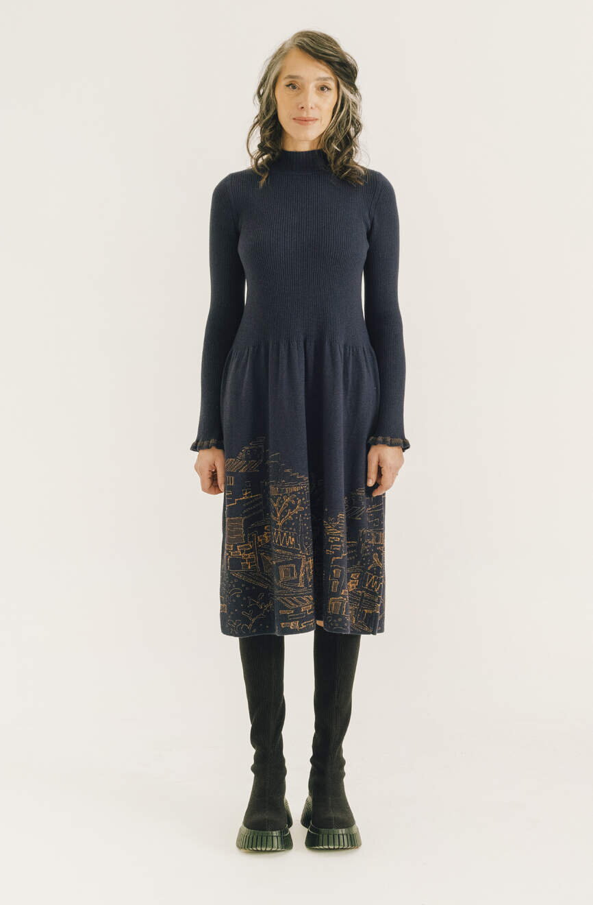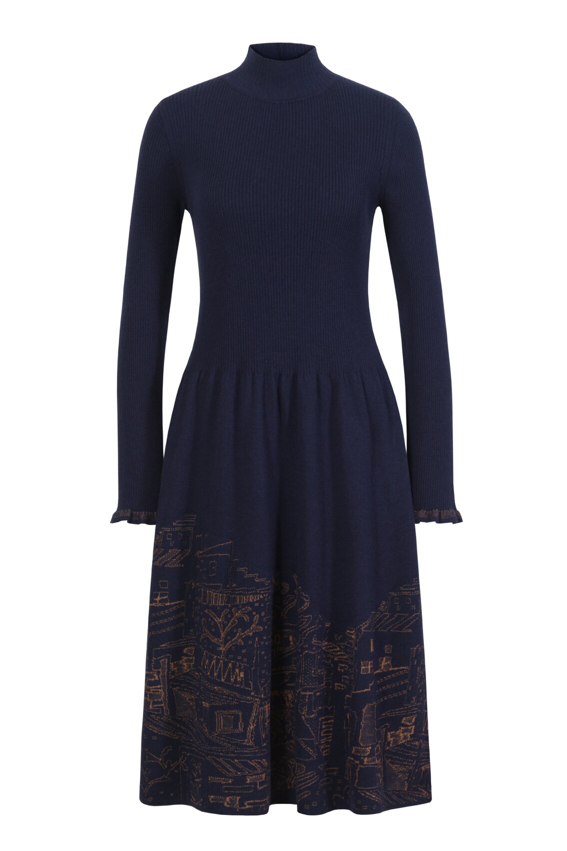 Taillierte Passform, gestrickt aus einer Woll-Viskose-Mischung mit Favela-Motiv. Es hat einen Rollkragen, lange Ärmel und geht in einen A-Linien-Rock über.