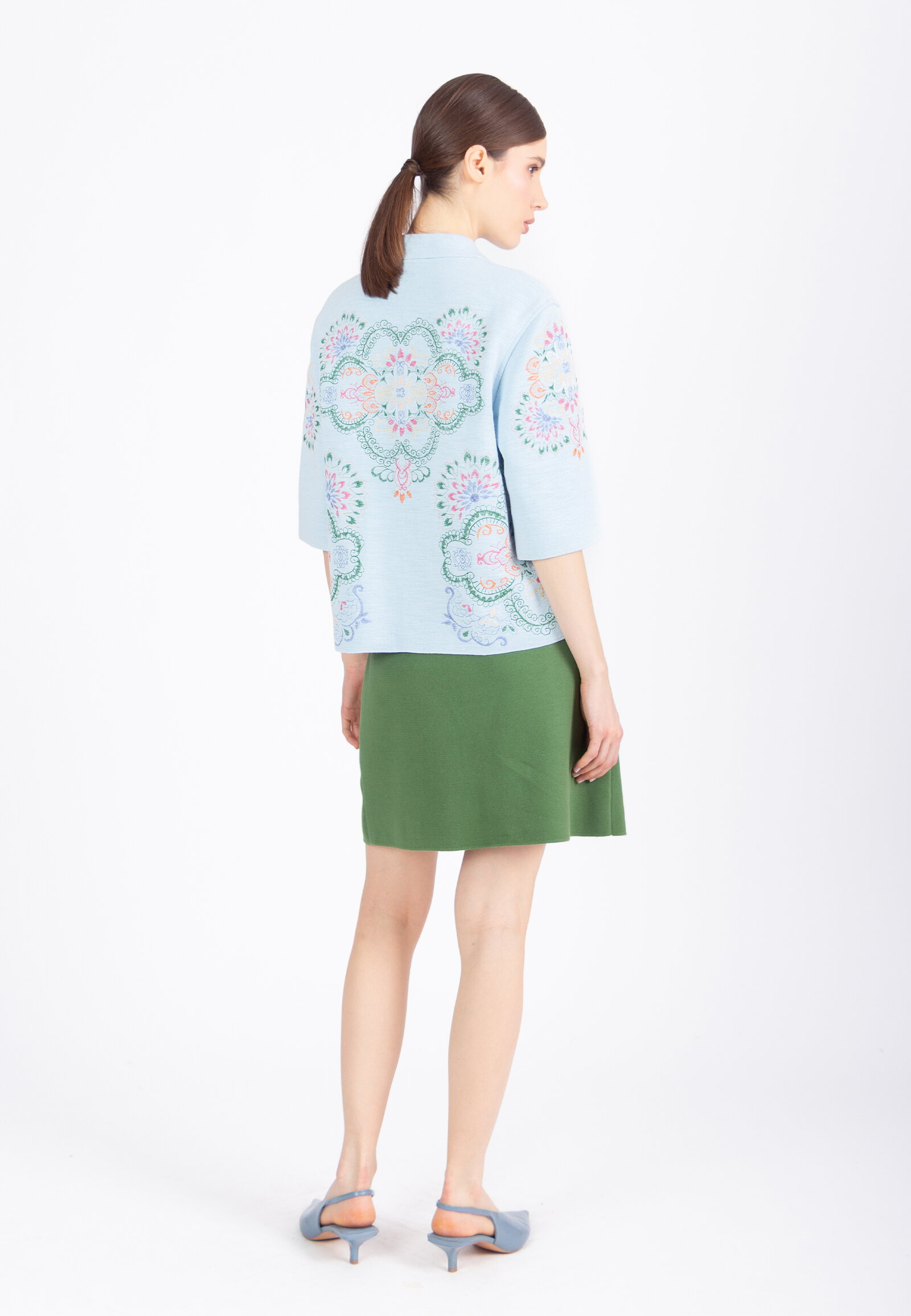 A cropped jacket knitted from cotton by IVKO Woman, adorned with elaborate embroidered ornamental motifs. Drawing from ceramics and lacework traditions, the embroidery adds artisanal depth. Cotton ensures breathable comfort.