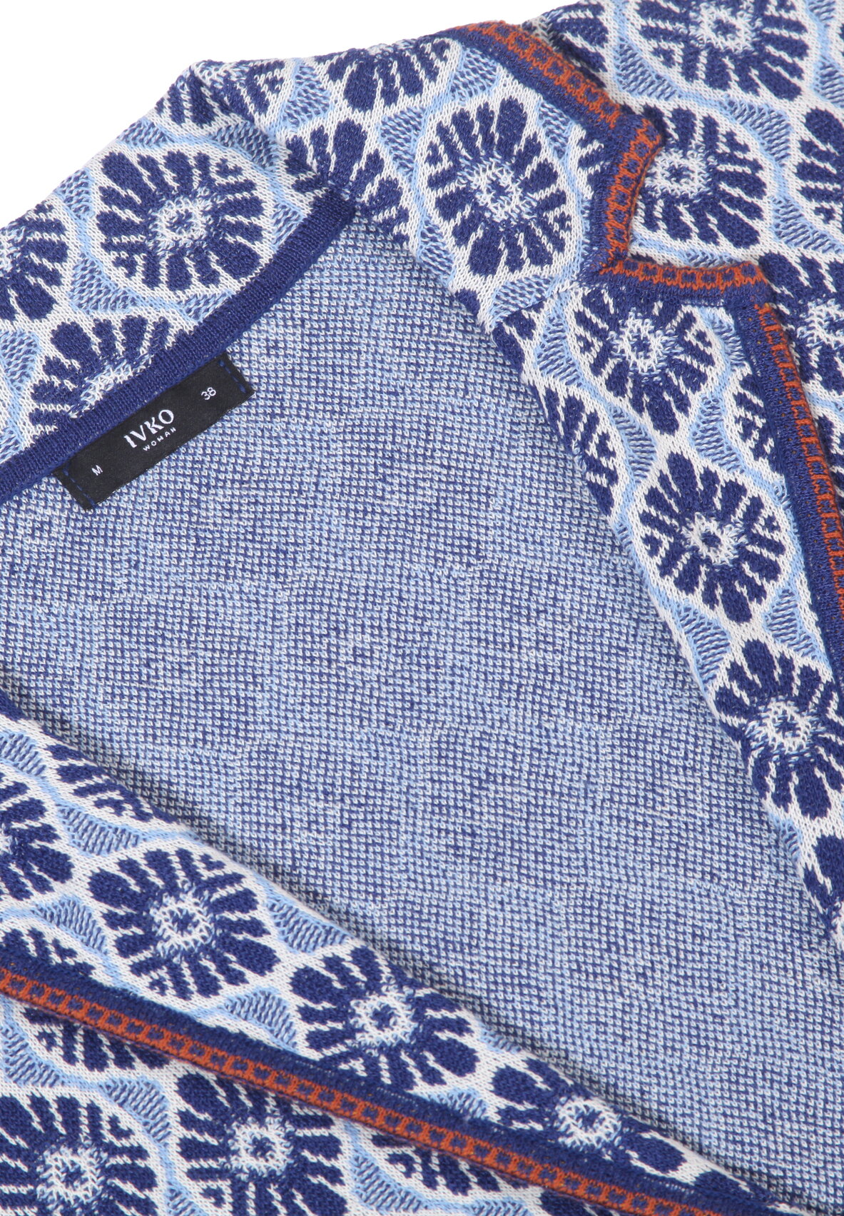 A tailored jacket with lapels knitted from a linen-cotton blend by IVKO Woman, featuring an intricate Mediterranean pattern. Olive leaves and maritime elements evoke coastal elegance. Linen ensures cool, breathable wear.