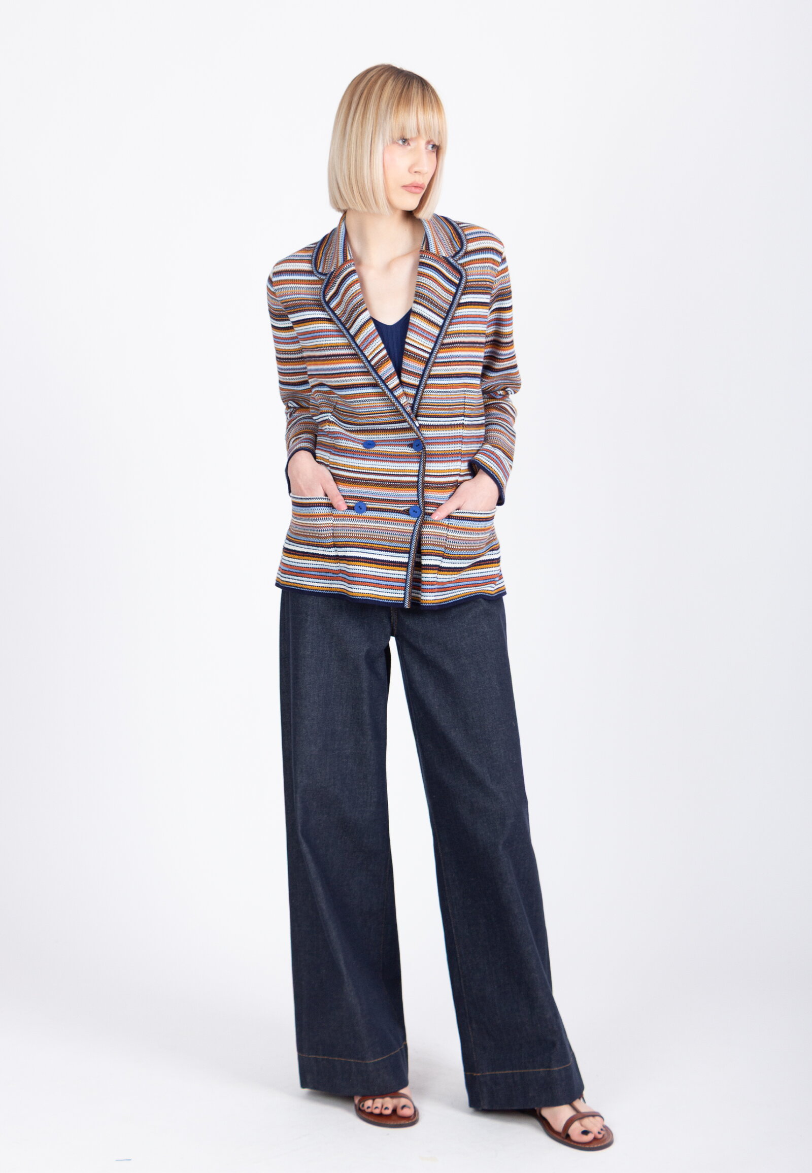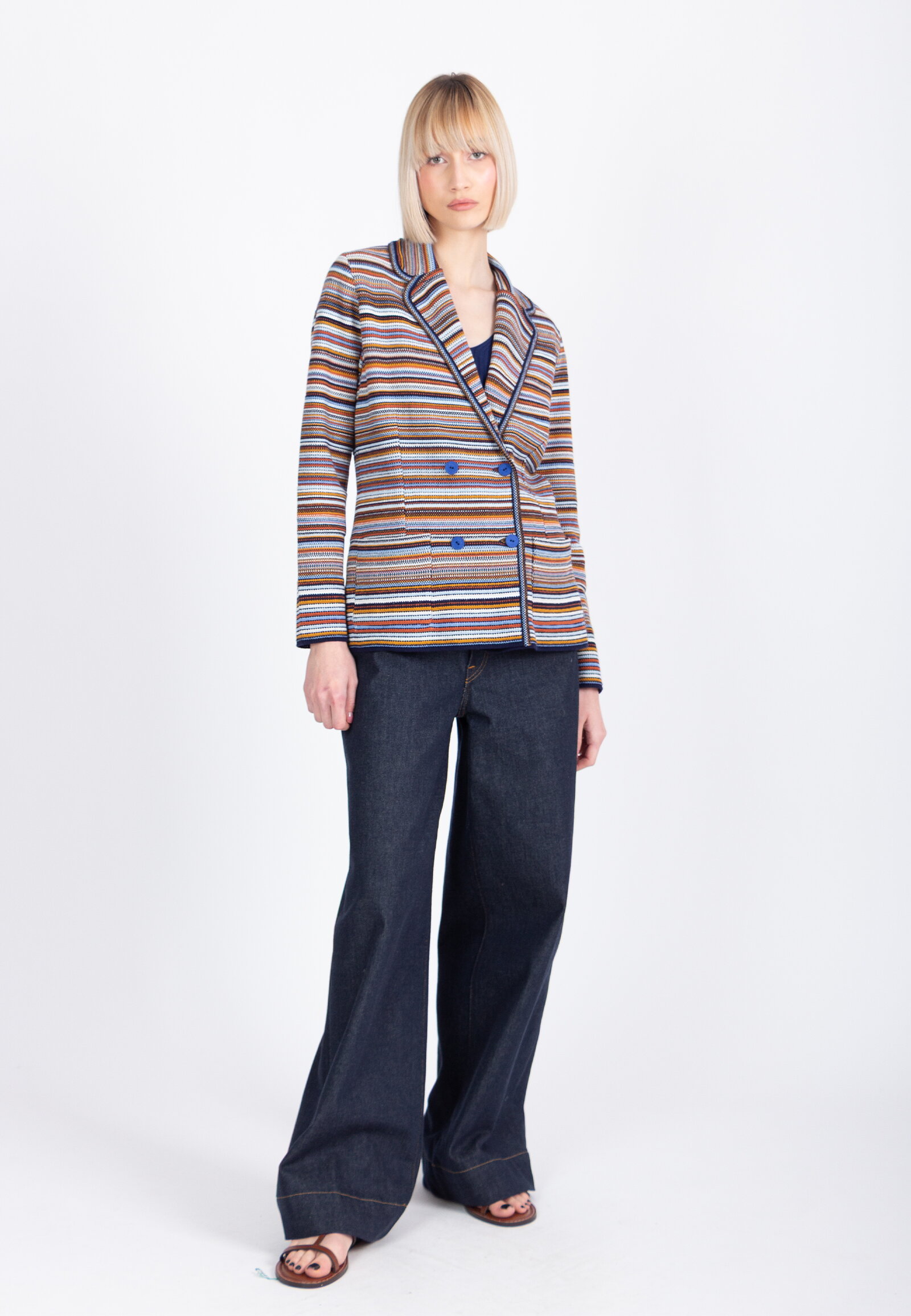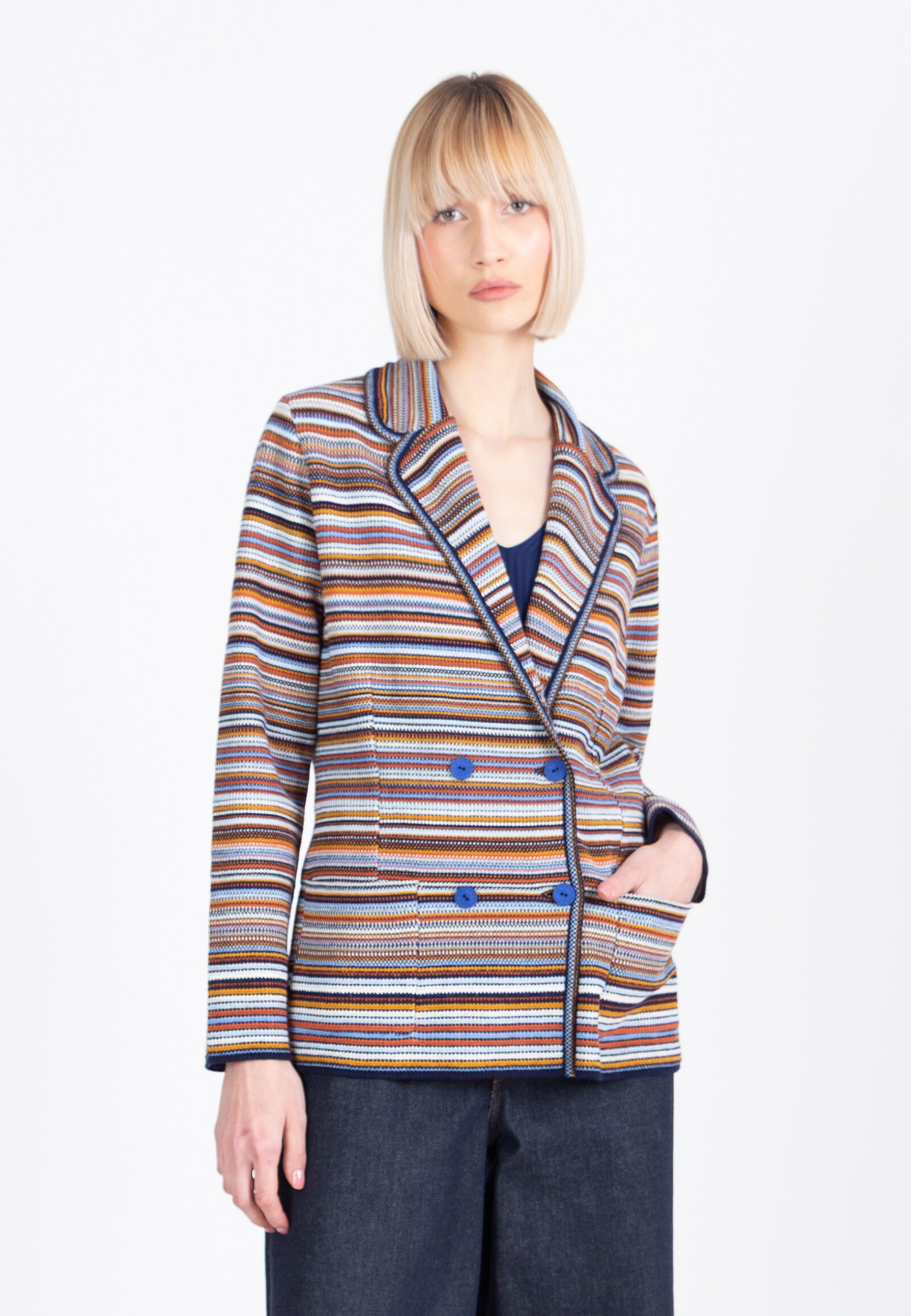 A tailored jacket knitted from pure cotton by IVKO Woman in a sophisticated jacquard stripe pattern. Shifting proportions and tonal variations bring textural depth and modern refinement. Cotton ensures versatile comfort.