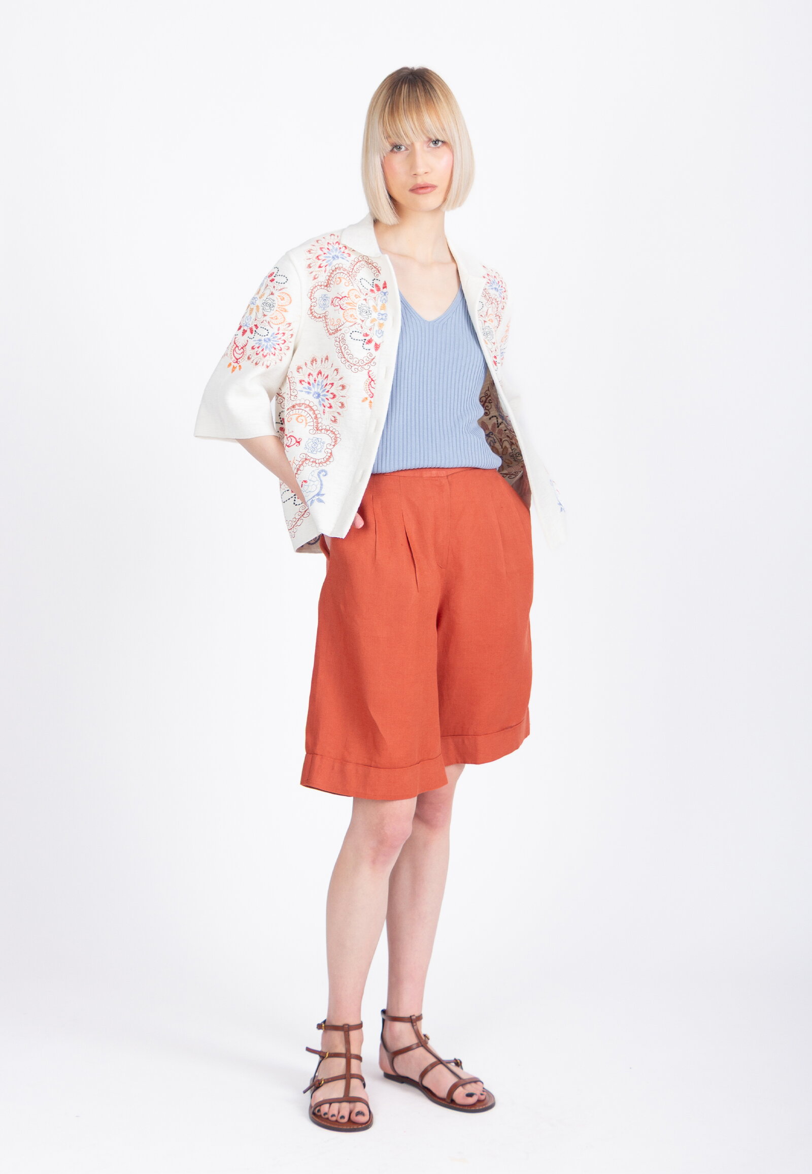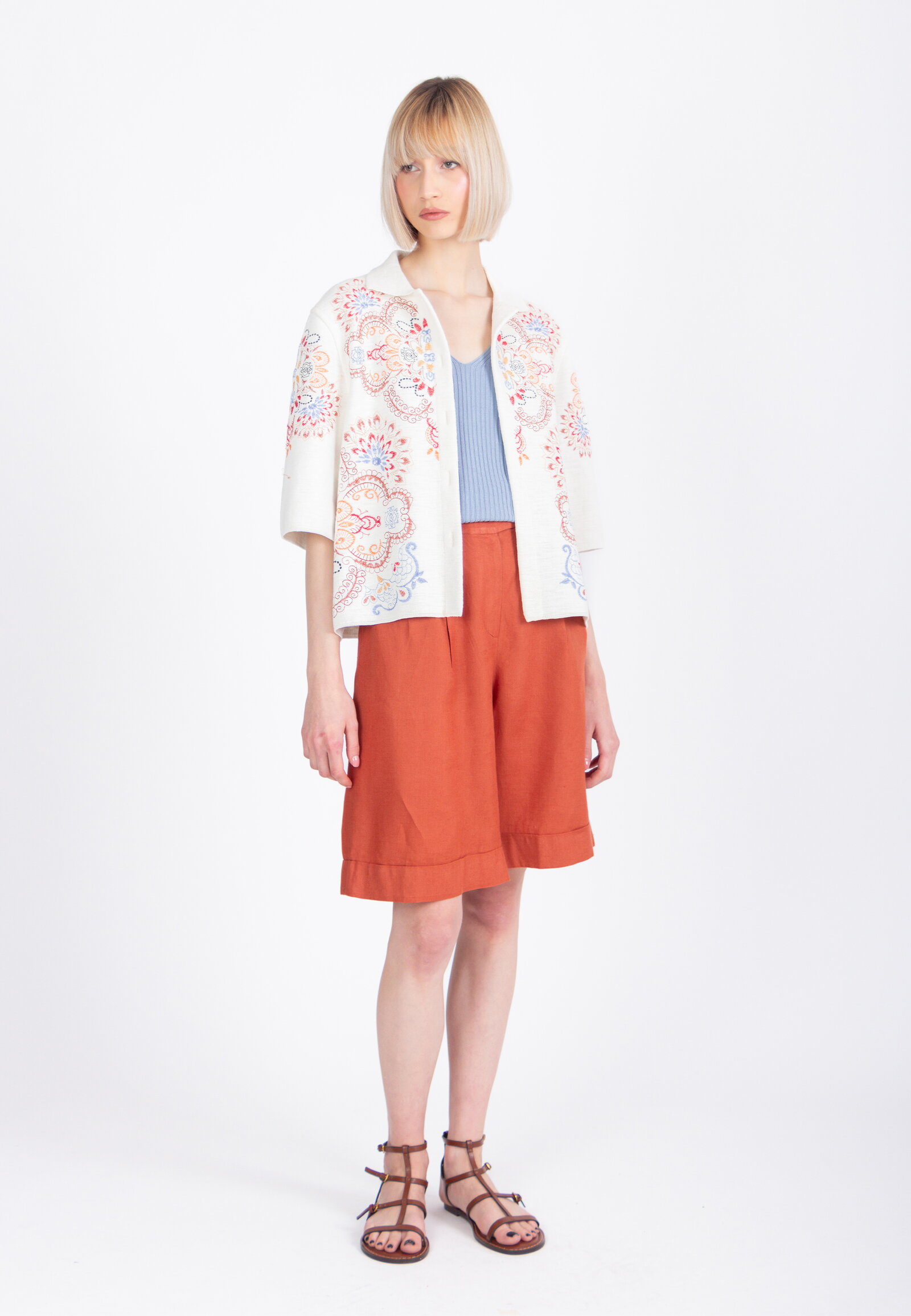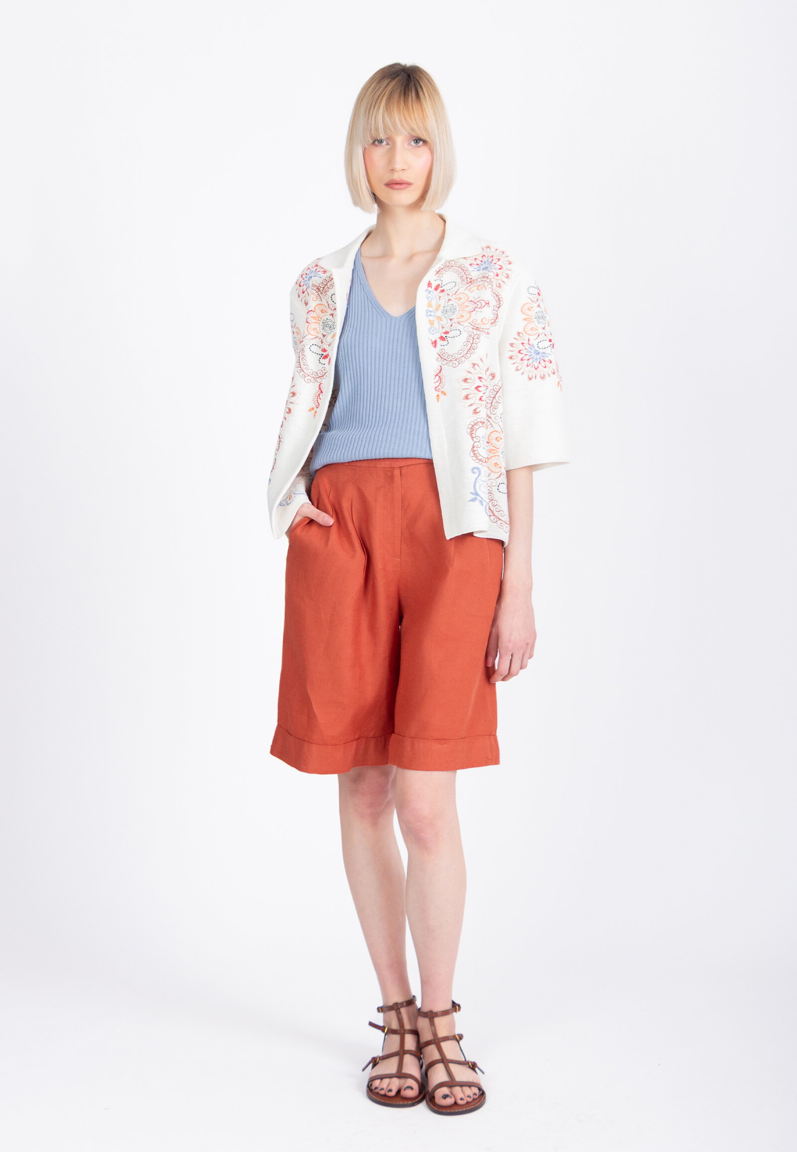A cropped jacket knitted from cotton by IVKO Woman, adorned with elaborate embroidered ornamental motifs. Drawing from ceramics and lacework traditions, the embroidery adds artisanal depth. Cotton ensures breathable comfort.