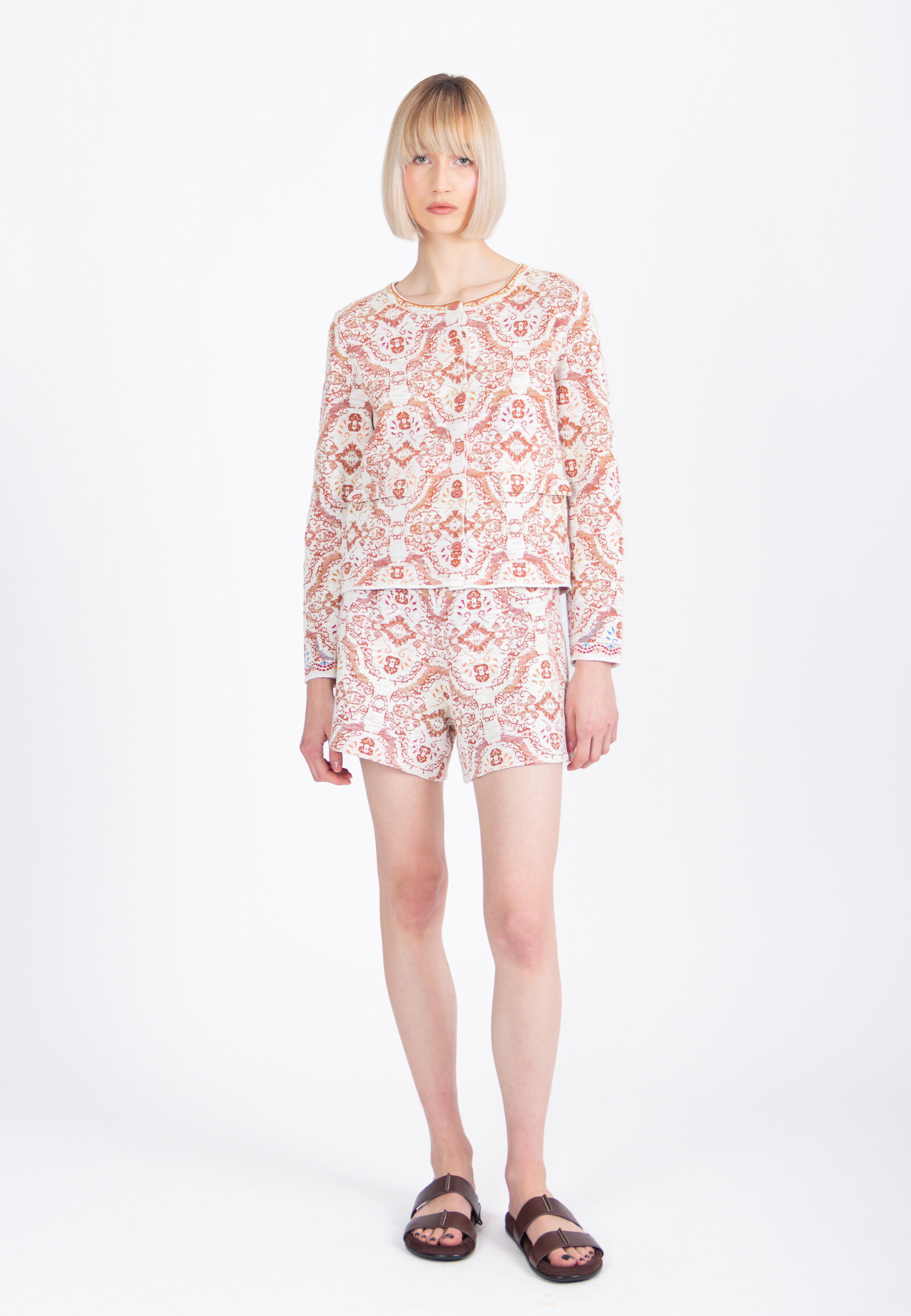 A structured jacket with pockets, knitted from cotton by IVKO Woman, with a refined ornament pattern drawn from mosaic and lacework traditions. Detailed jacquard celebrates ornamental craftsmanship in a modern silhouette.