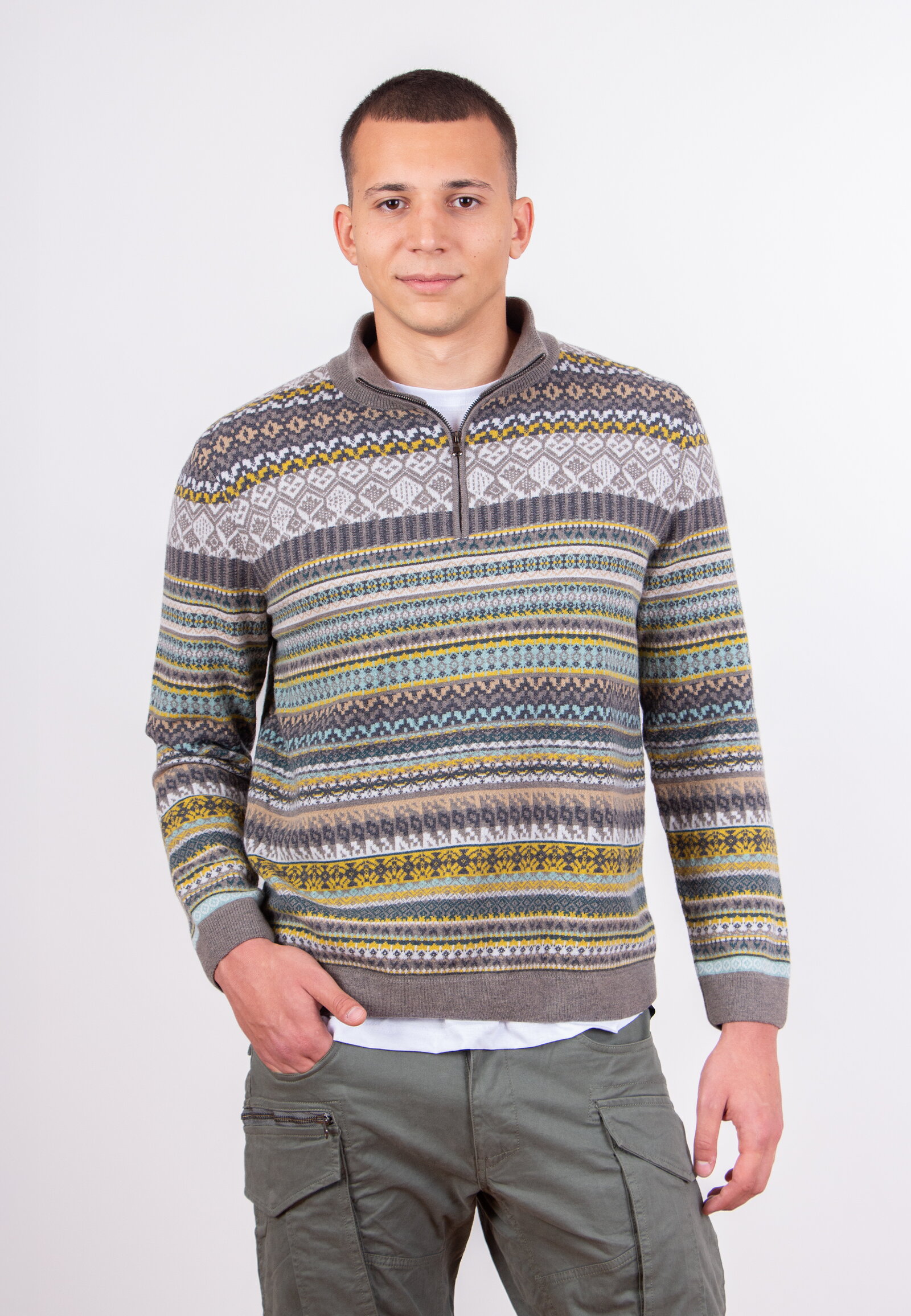 Fair Isle muški zip-up džemper ispleten je od 100 % vune, sa prepoznatljivim Fair Isle motivom koji definiše izgled artikla. Ovaj muški vuneni džemper sa rajsferšlusom ima duge rukave i jasan, klasičan kroj.