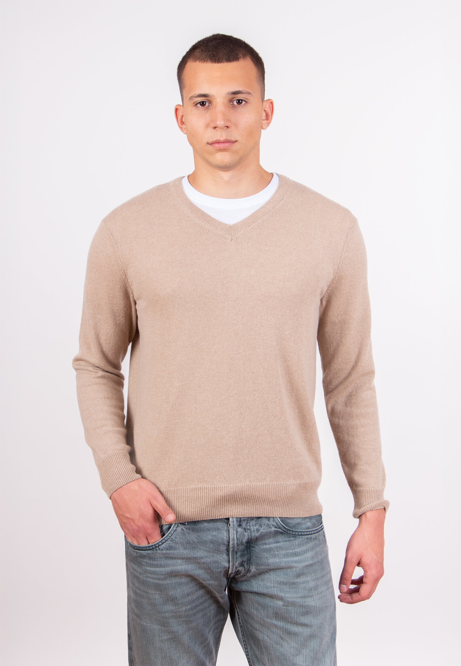 Muški džemper sa V-izrezom ispleten je od mešavine kašmira, sa fokusom na kvalitet materijala i sastav pletiva. Dugi rukavi i jasna linija kroja čine ovaj artikal jednostavnim i lako uklopivim u različite stilove oblačenja.