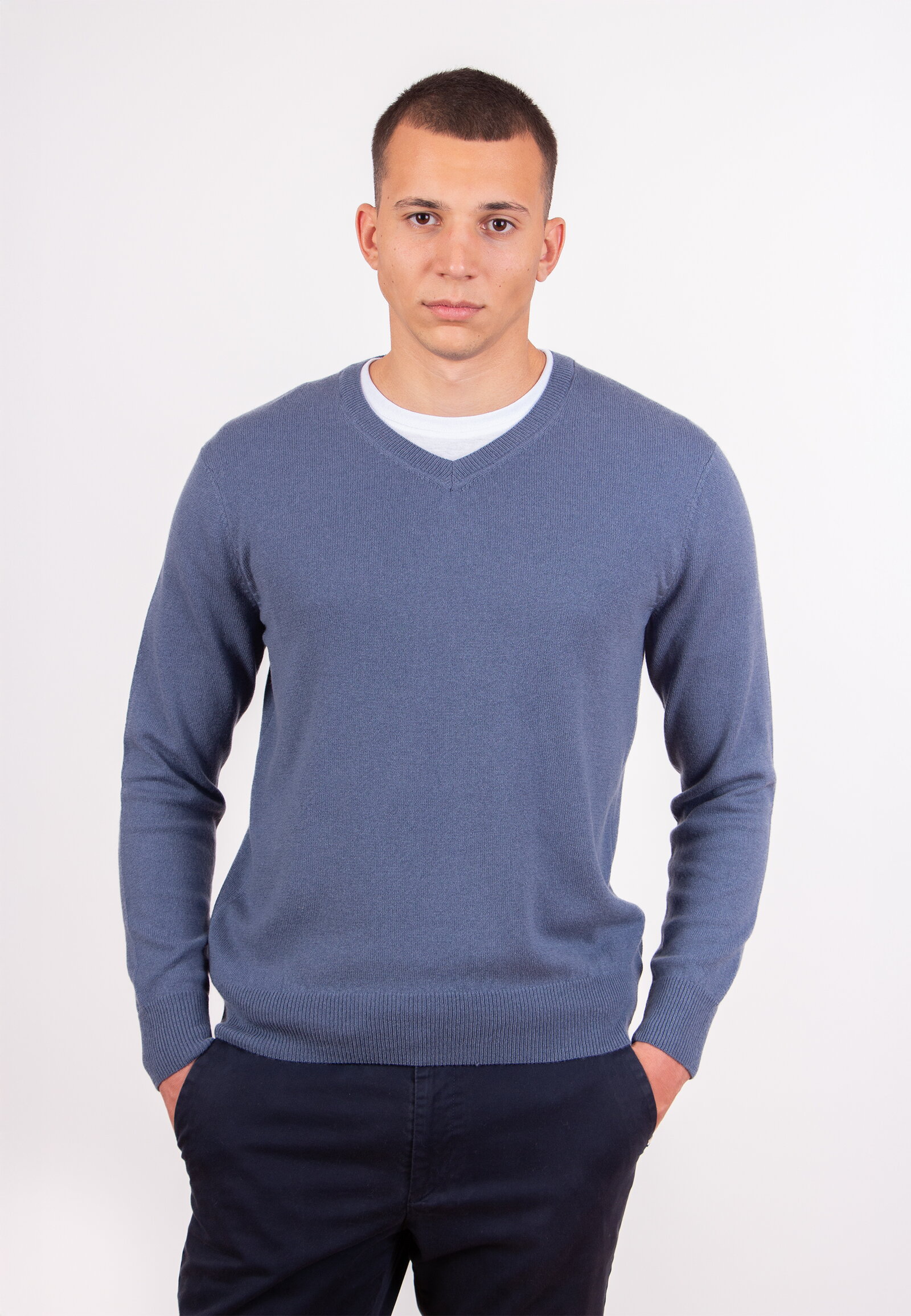 Muški džemper sa V-izrezom ispleten je od mešavine kašmira, sa fokusom na kvalitet materijala i sastav pletiva. Dugi rukavi i jasna linija kroja čine ovaj artikal jednostavnim i lako uklopivim u različite stilove oblačenja.