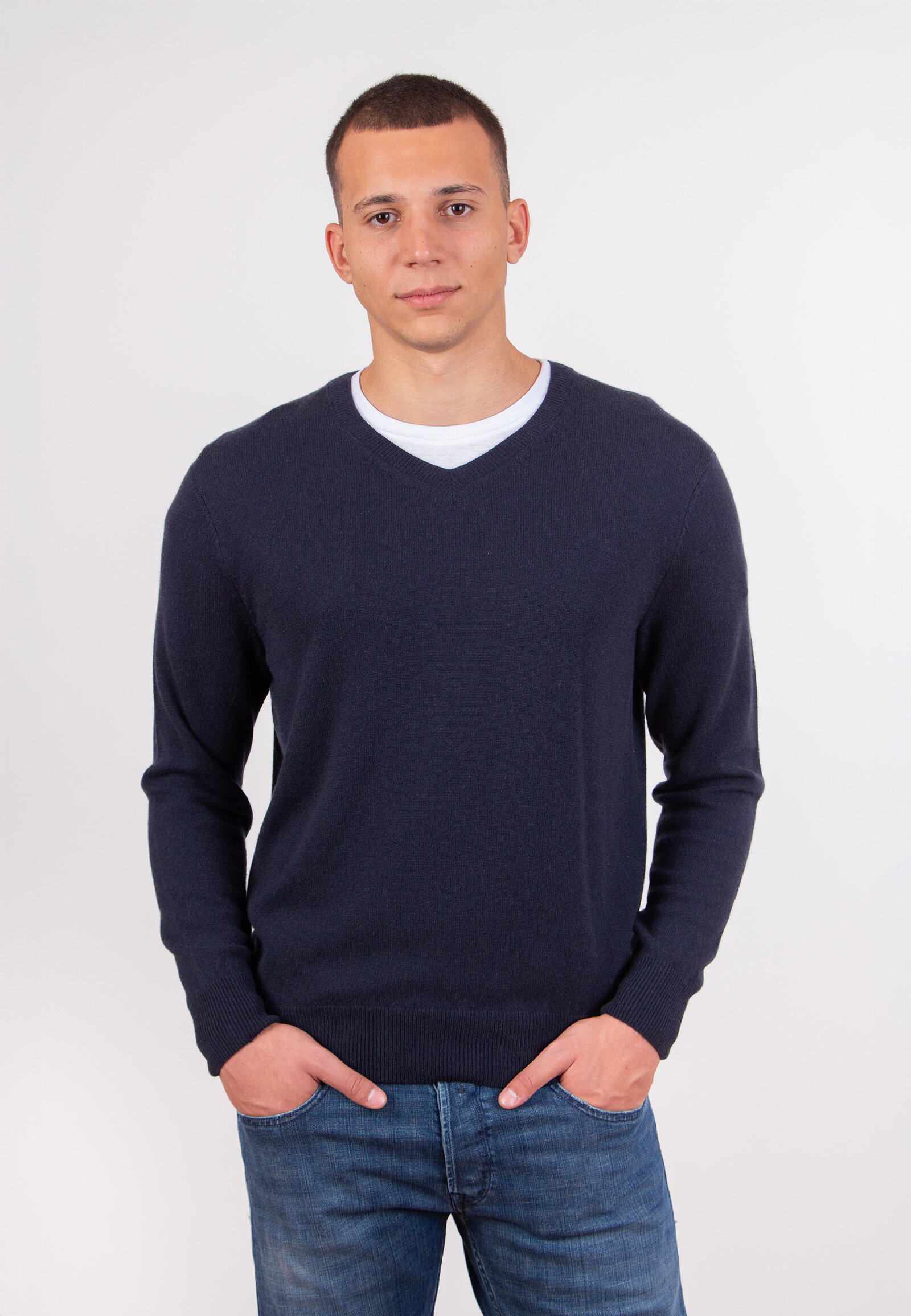 Muški džemper sa V-izrezom ispleten je od mešavine kašmira, sa fokusom na kvalitet materijala i sastav pletiva. Dugi rukavi i jasna linija kroja čine ovaj artikal jednostavnim i lako uklopivim u različite stilove oblačenja.
