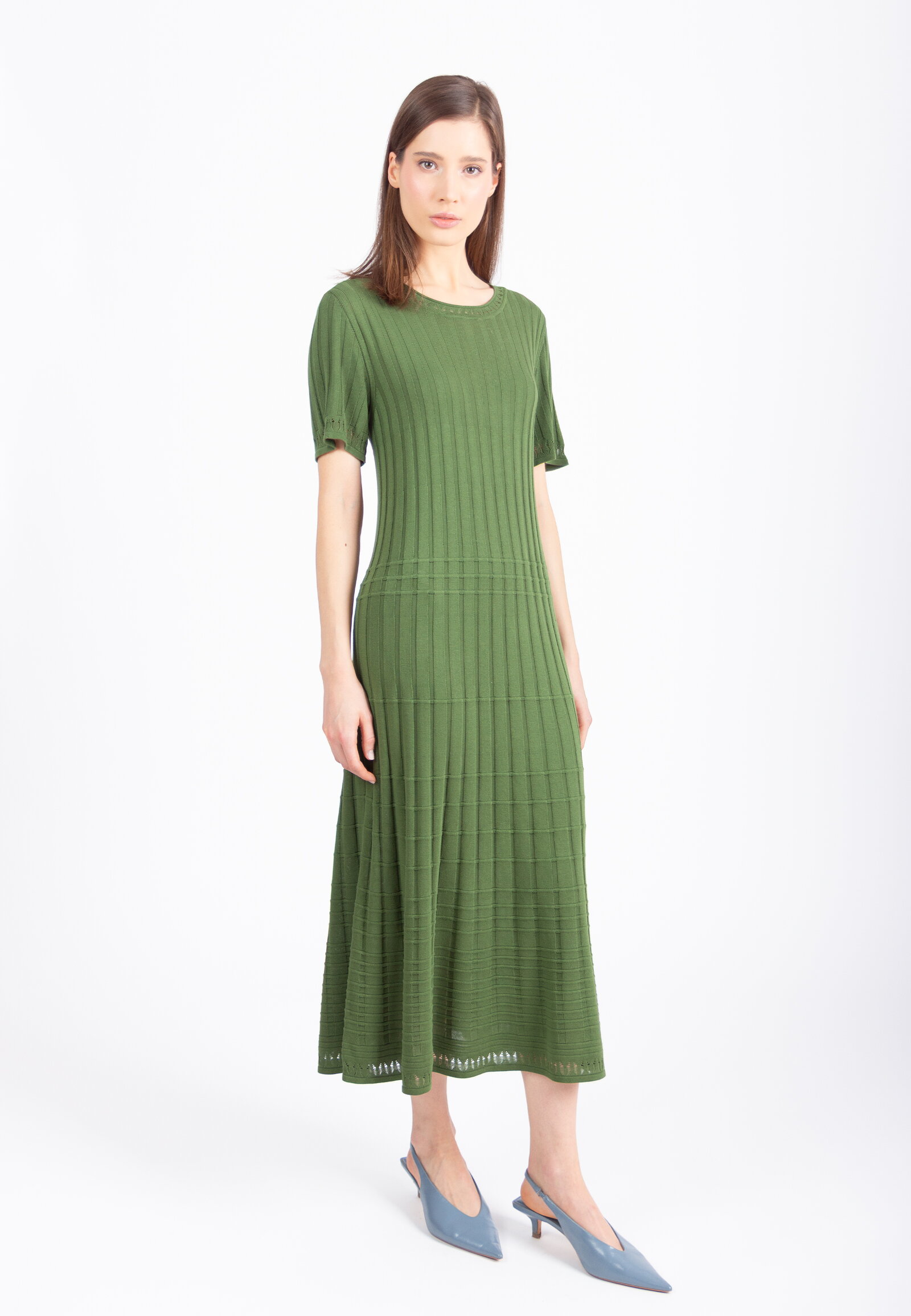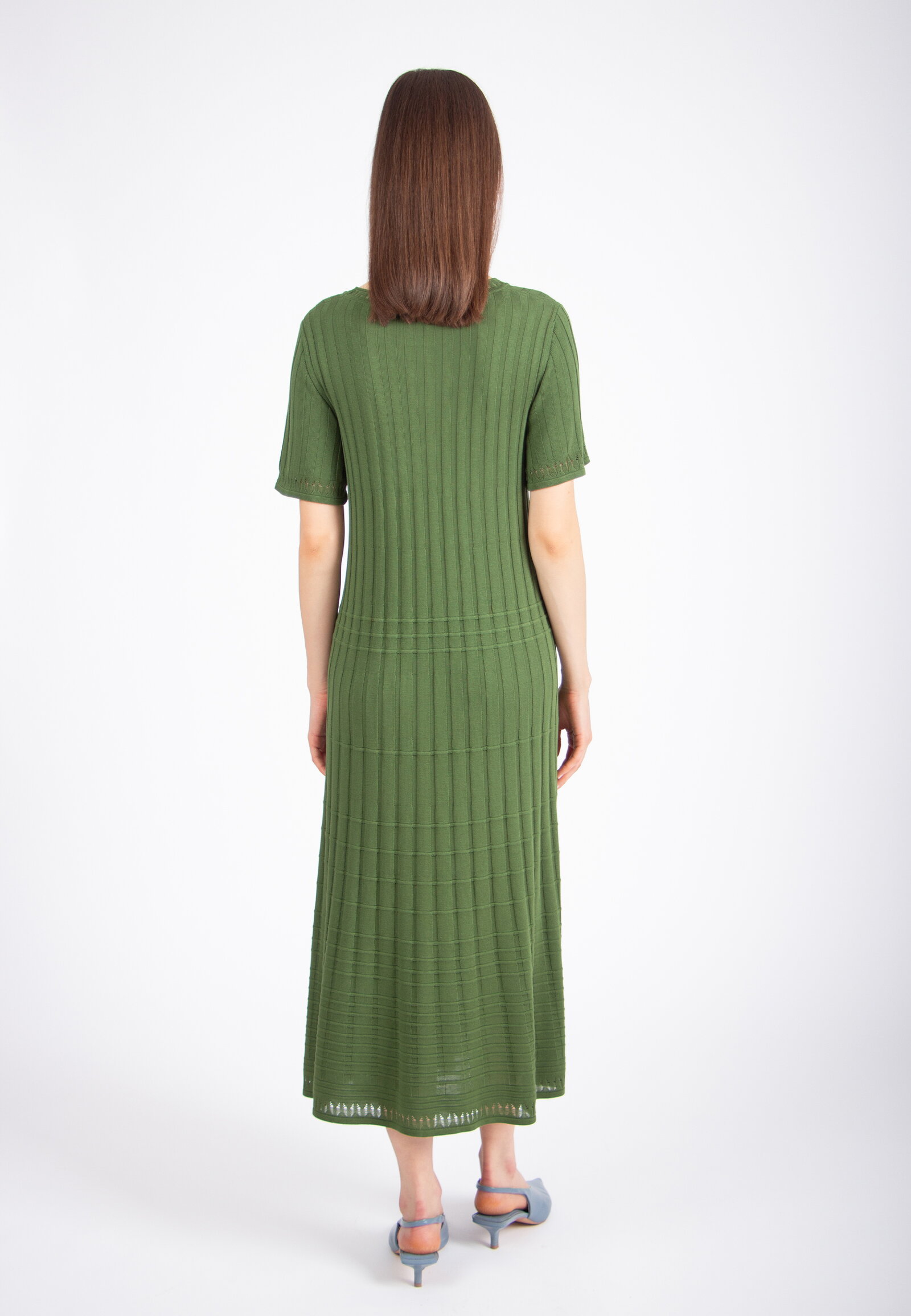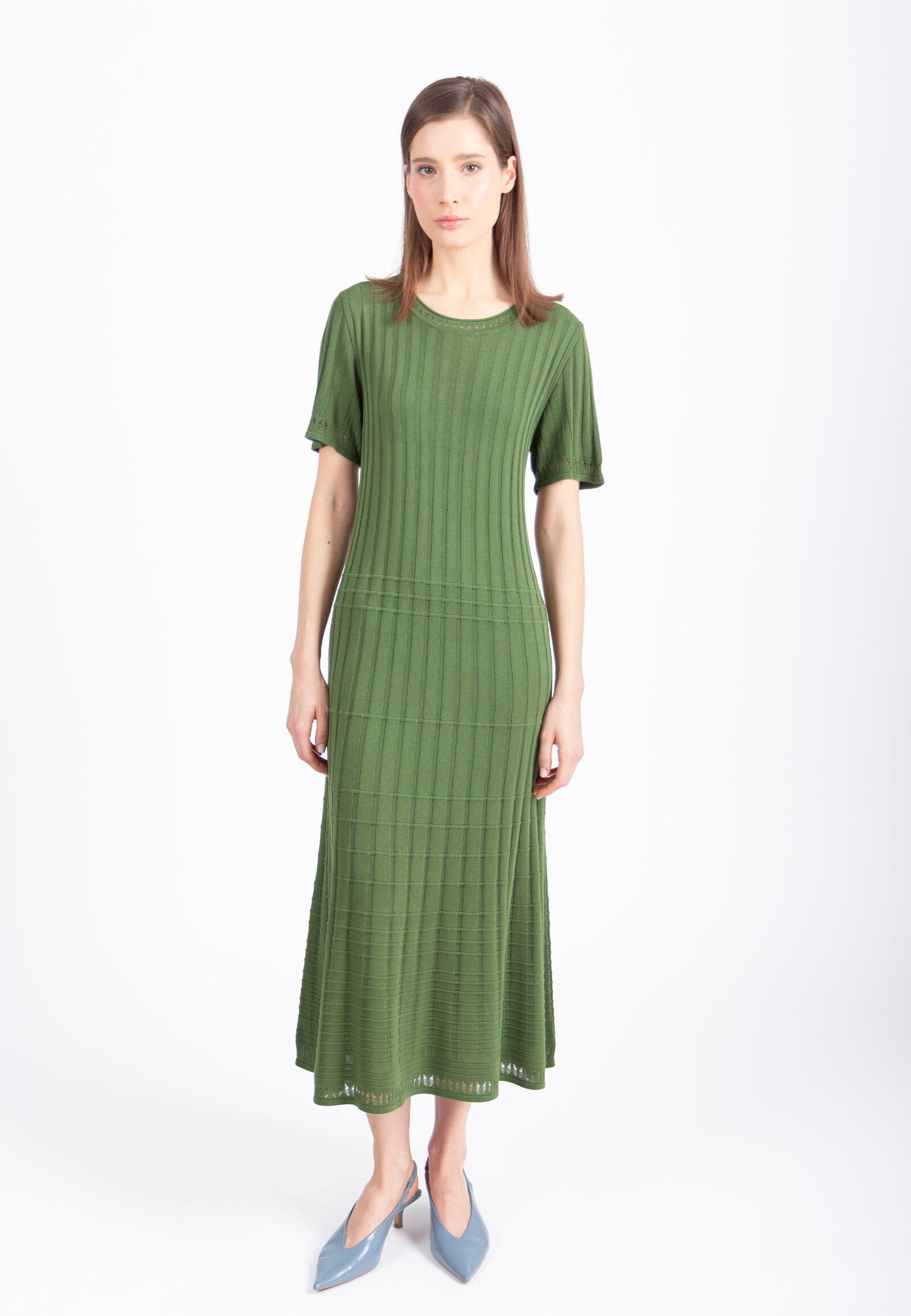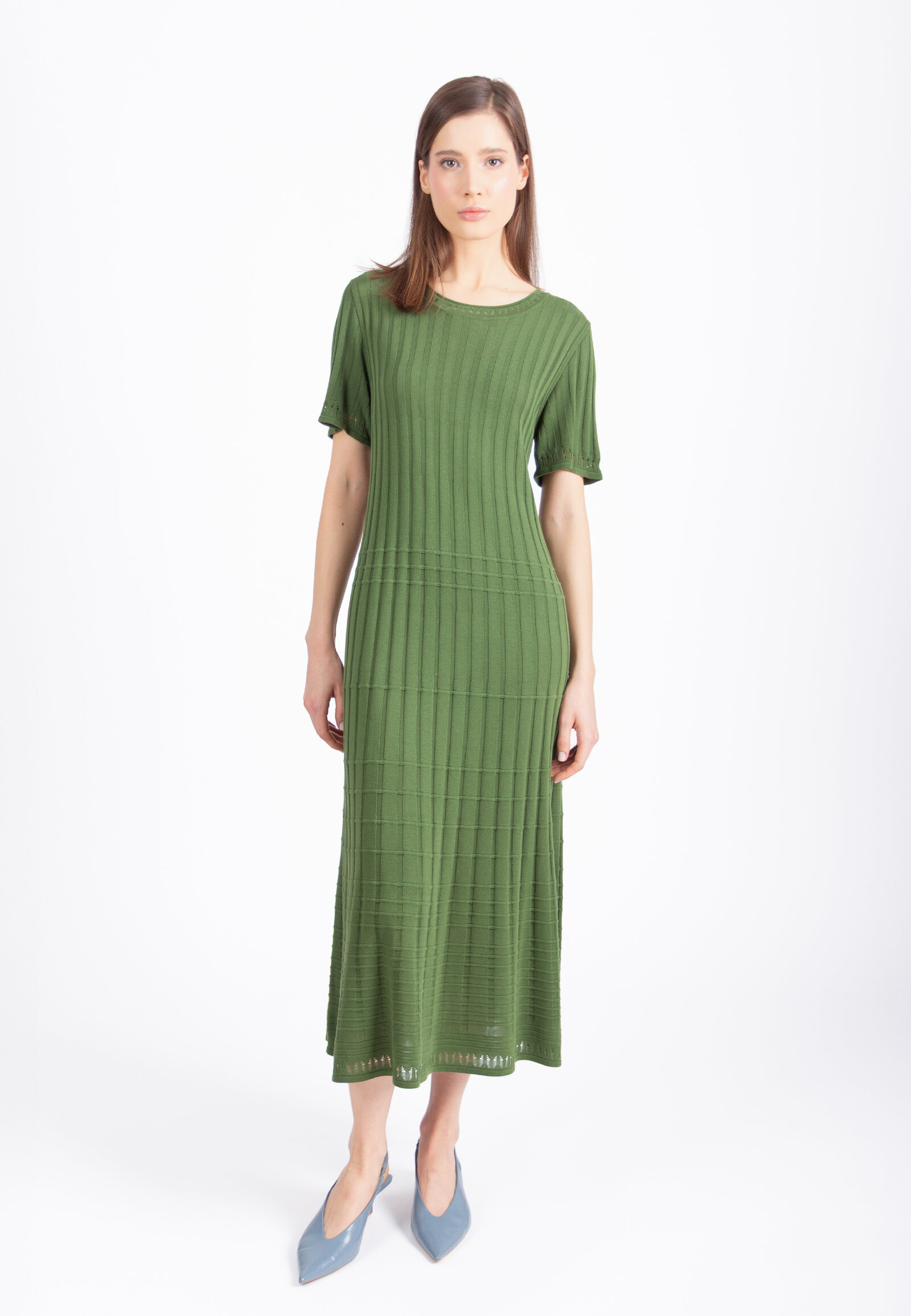 IVKO Woman haljina sa okruglim izrezom ispletena od viskoze naglašava rebrastu strukturu u čistom tonu. Ima midi dužinu i siluetu koja ostaje uredna i stabilna u pokretu.