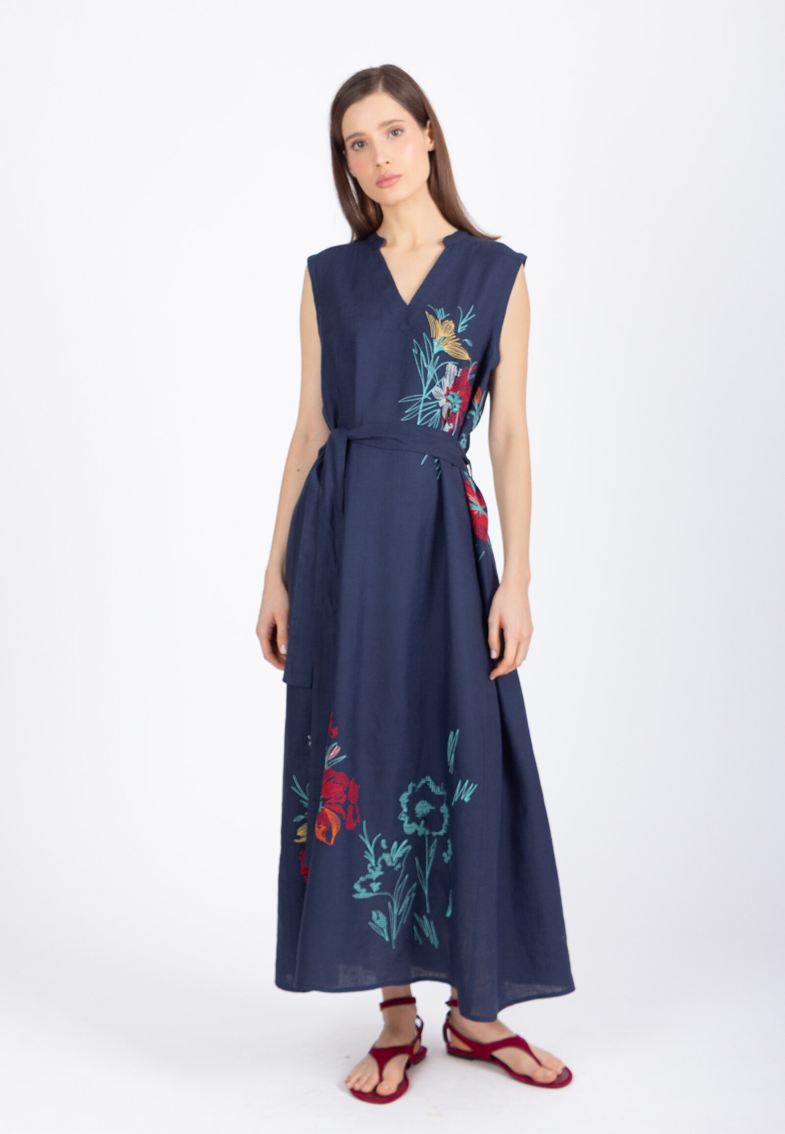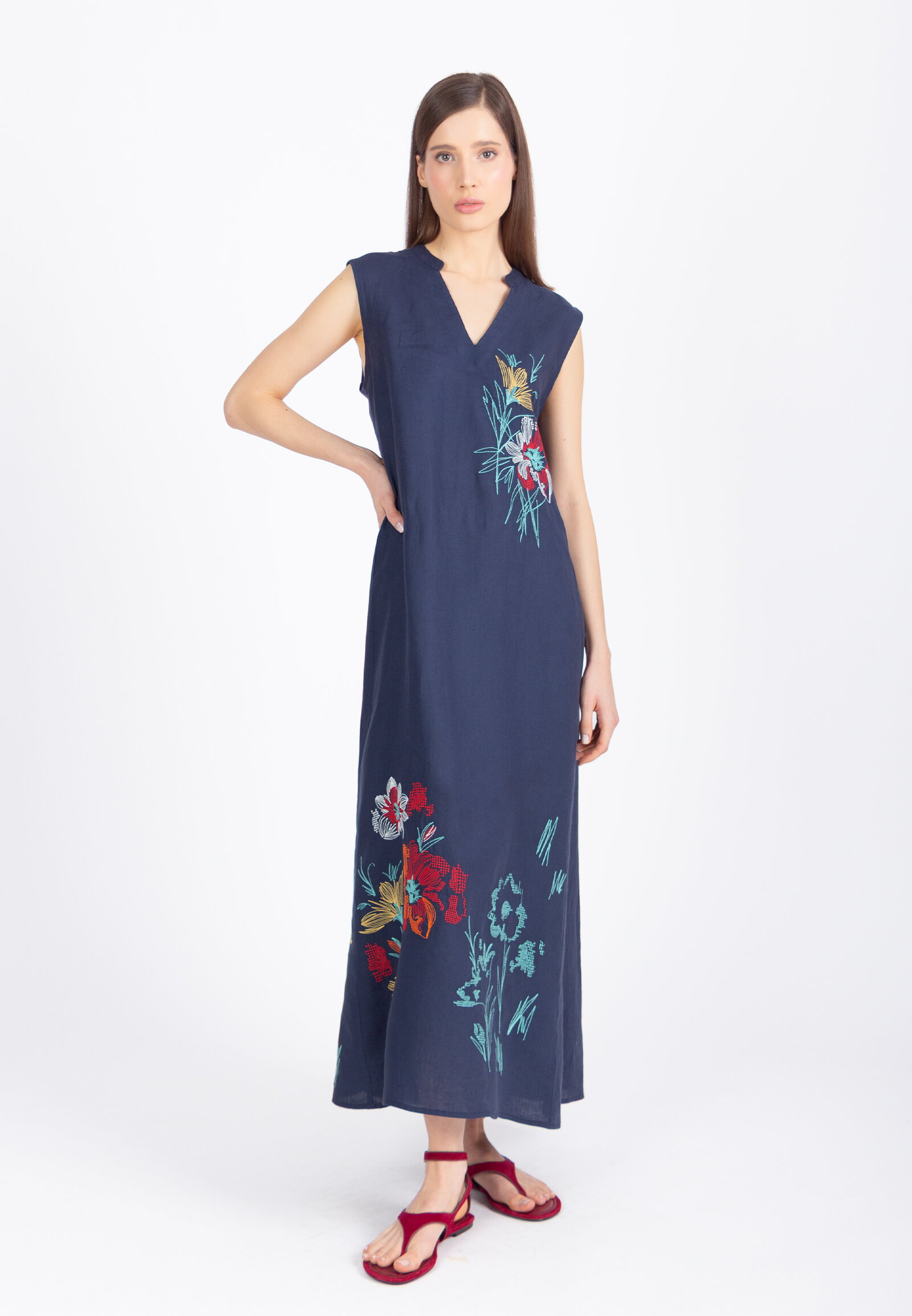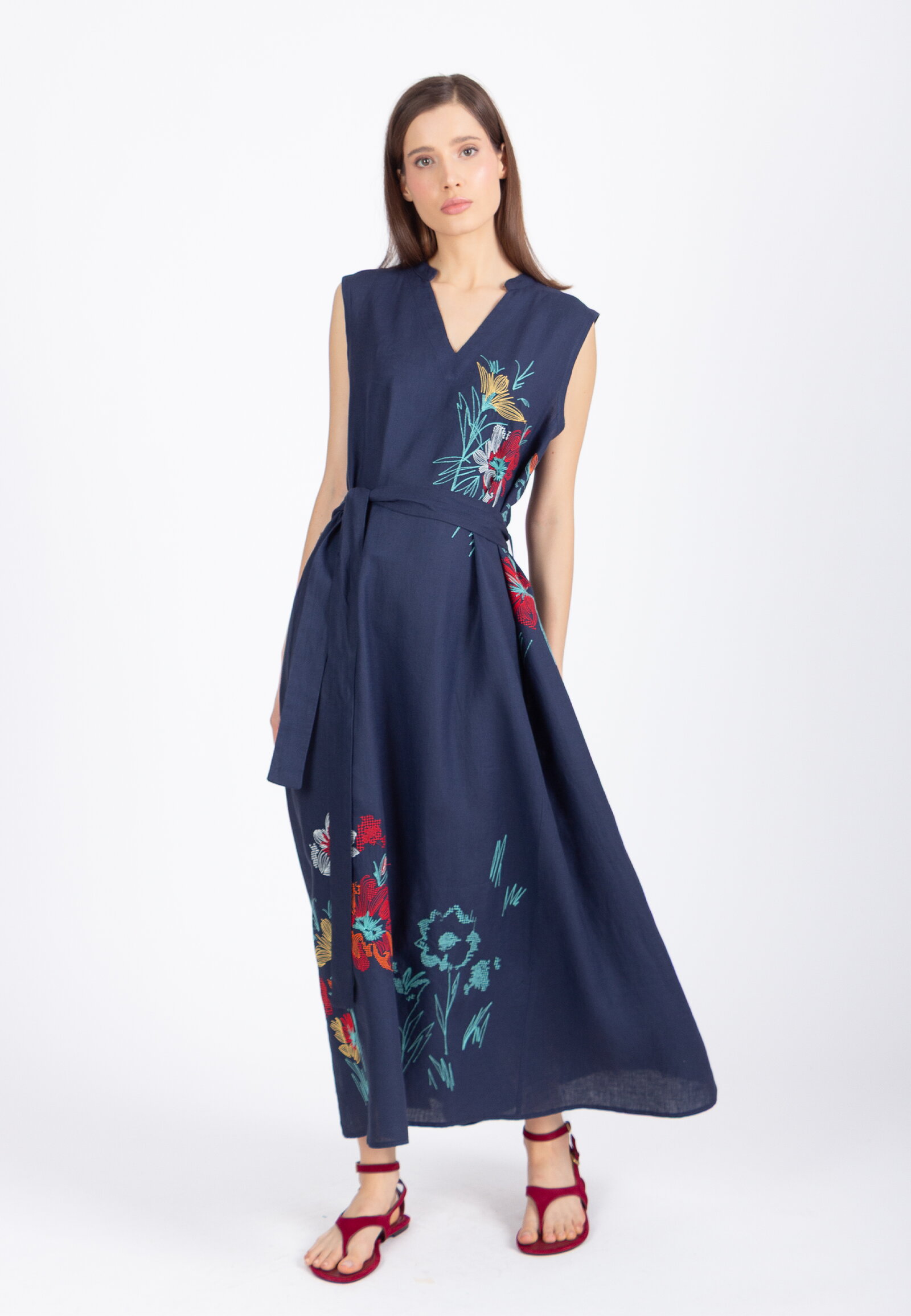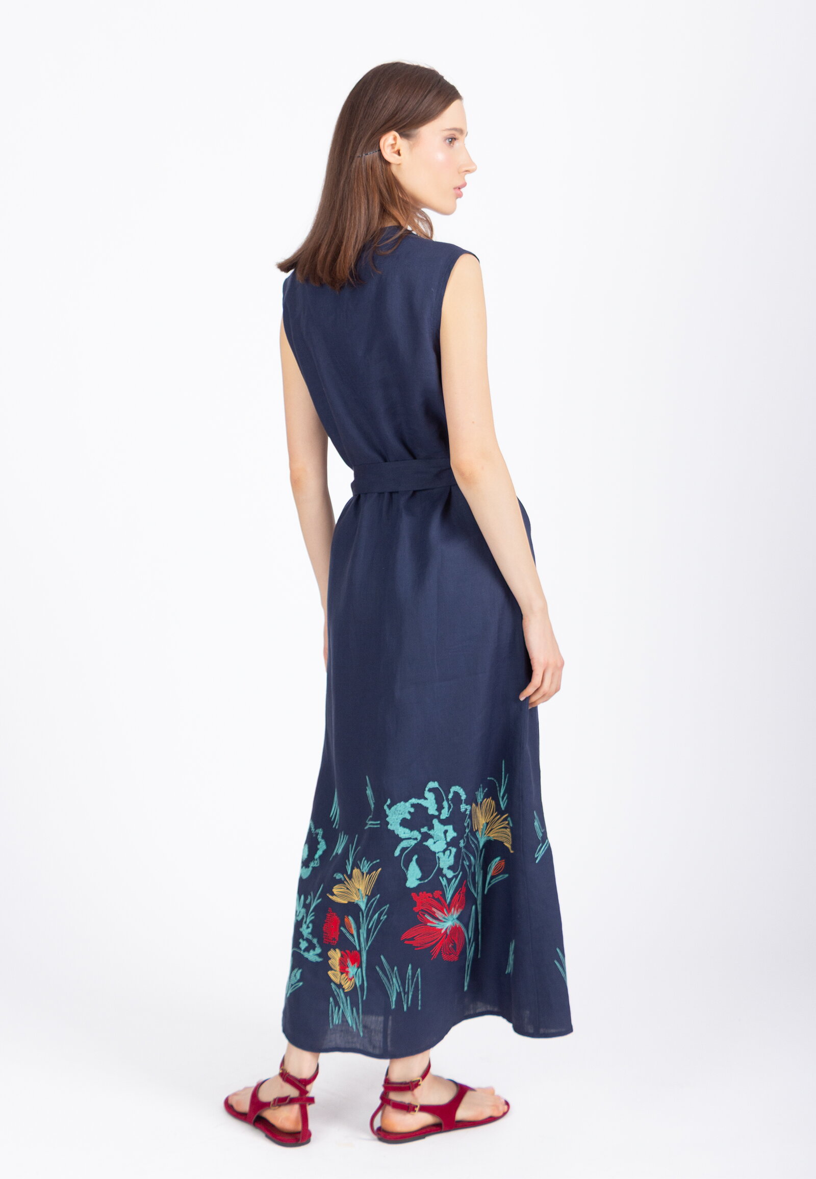 Lanena IVKO Woman haljina sa vezom u Cvetnom motivu ispletena od lana ističe botaničku inspiraciju kroz izražen detalj. Poseduje okrugli izrez i formu bez rukava.