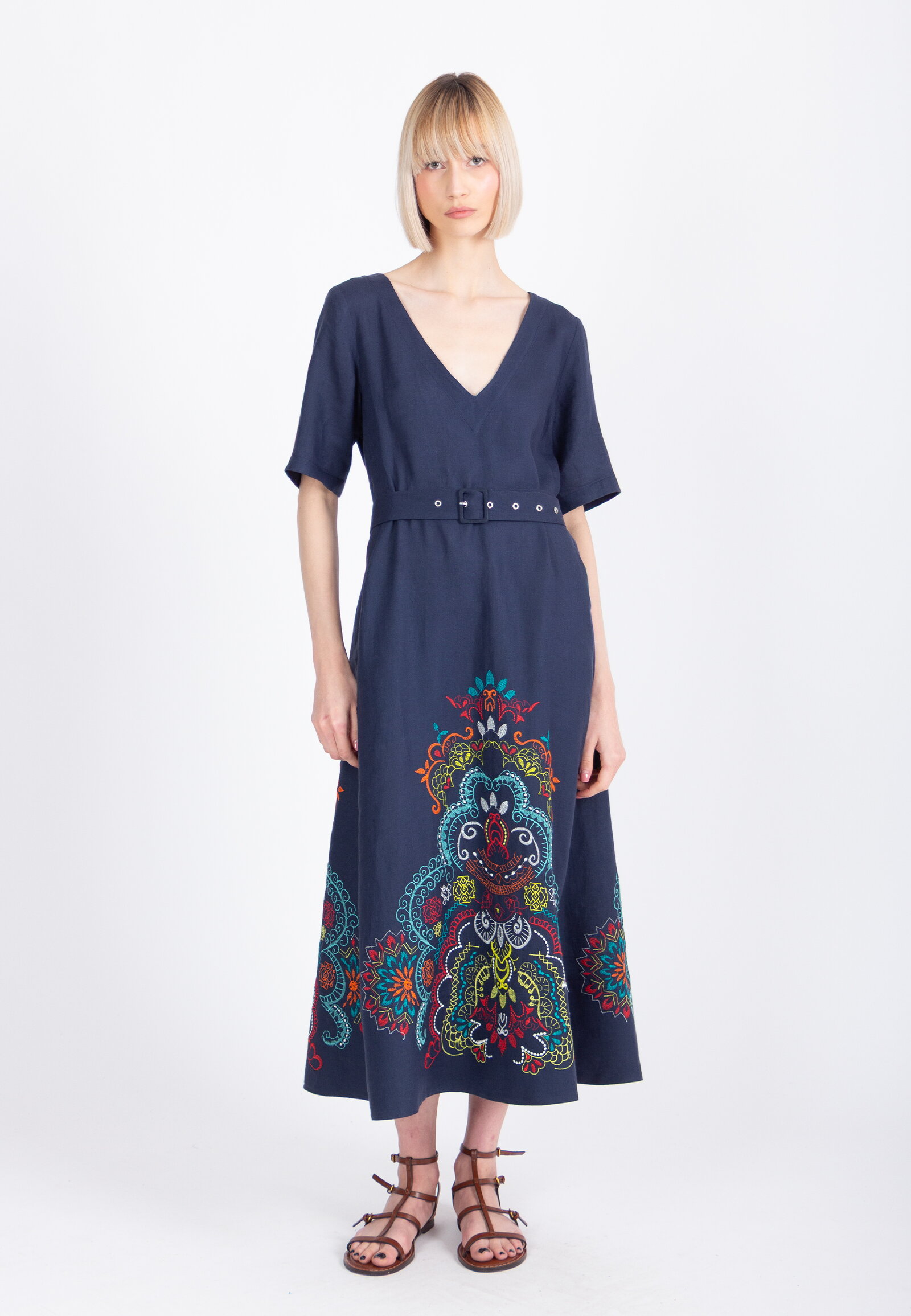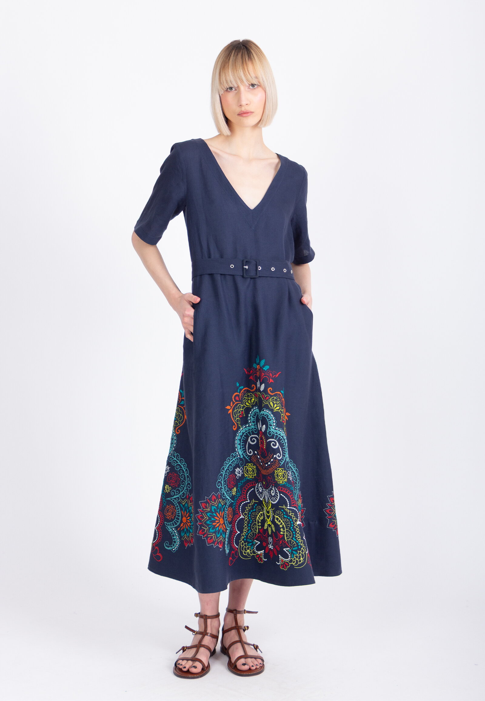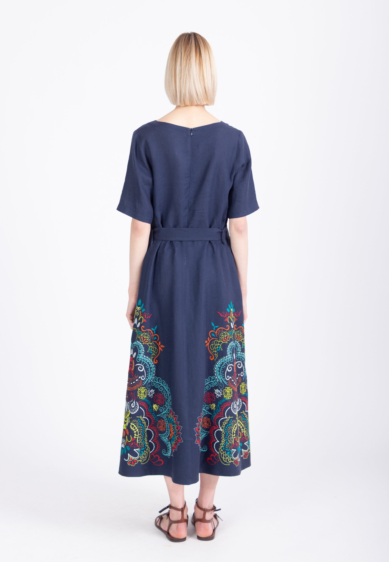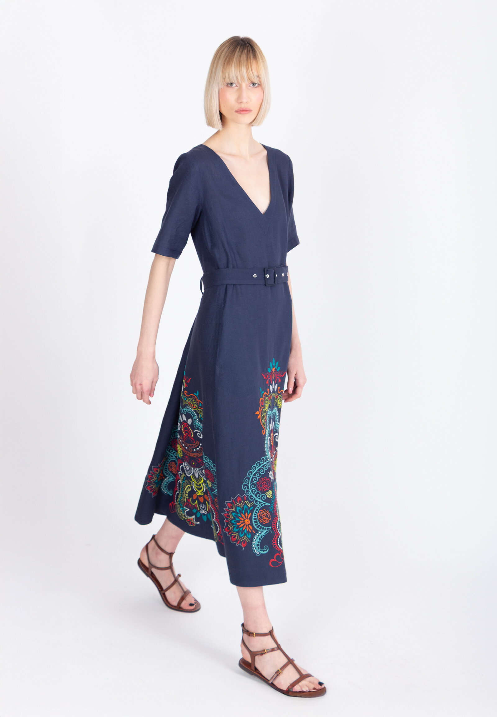 IVKO Woman haljina sa Mediteran motivom ispletena od pamuka naglašava razigrane obalne motive u savremenoj interpretaciji. Poseduje okrugli izrez i kratke rukave.