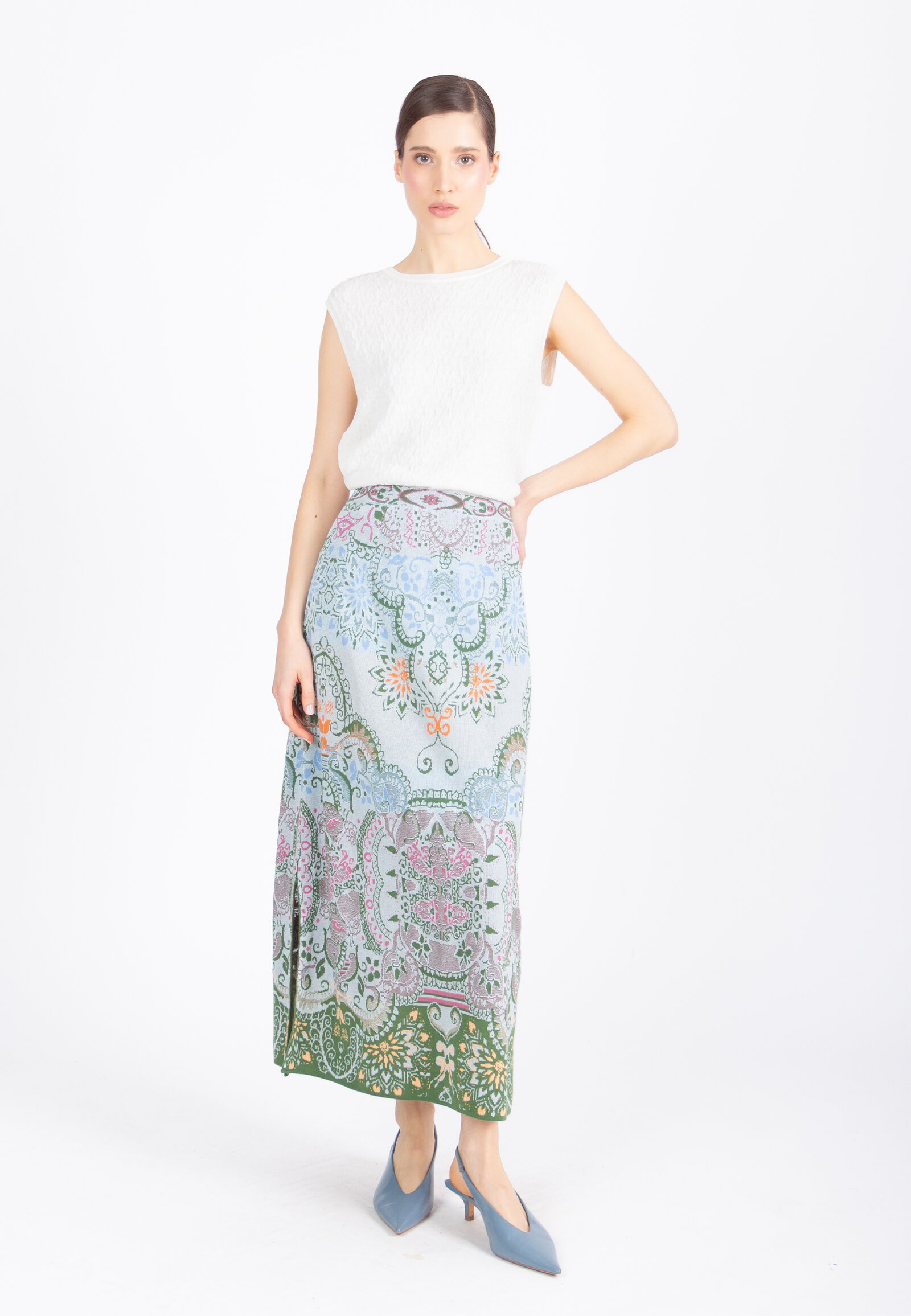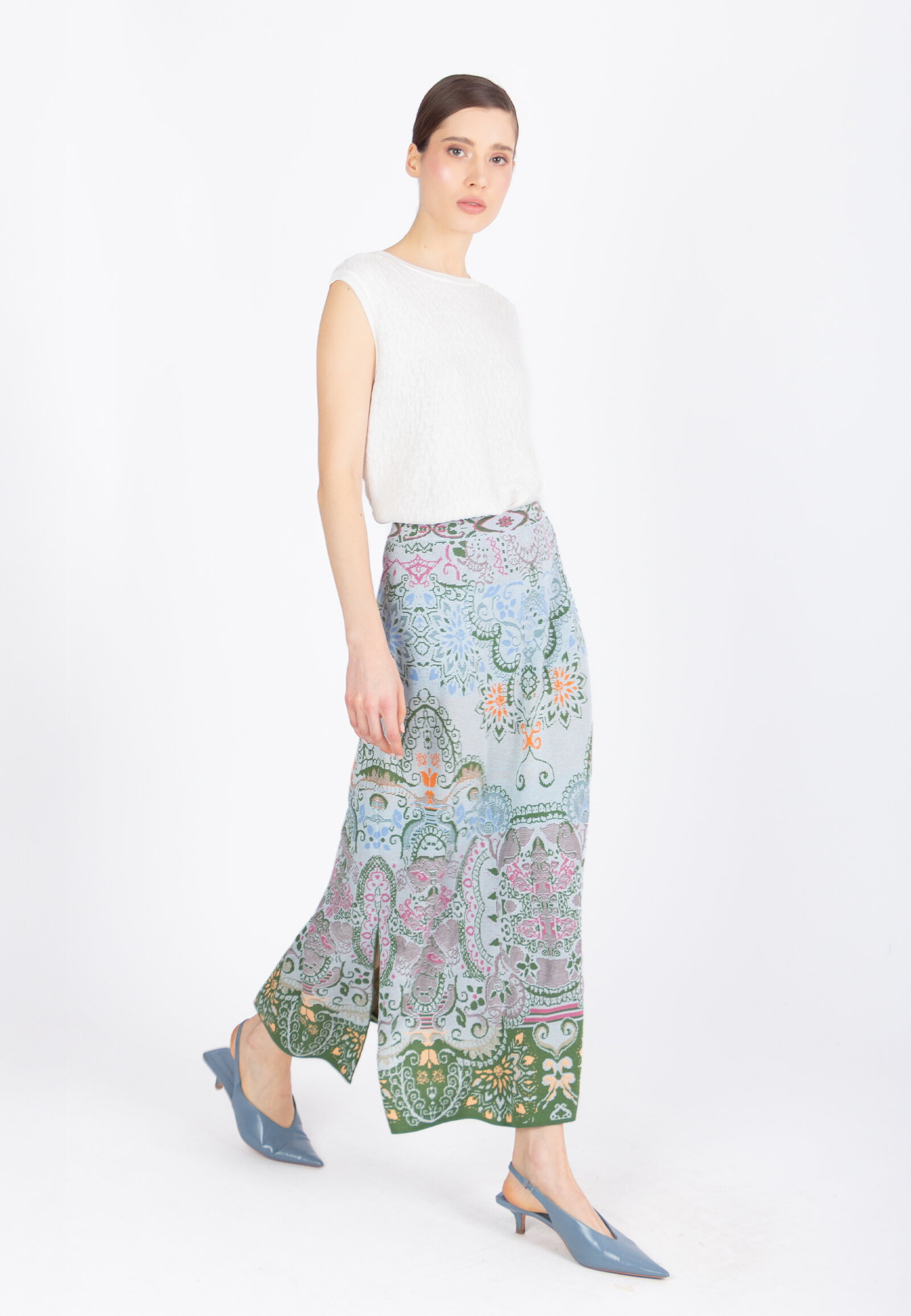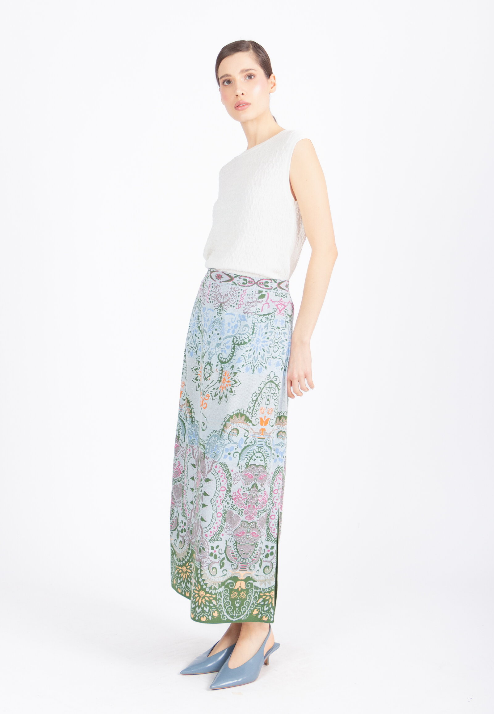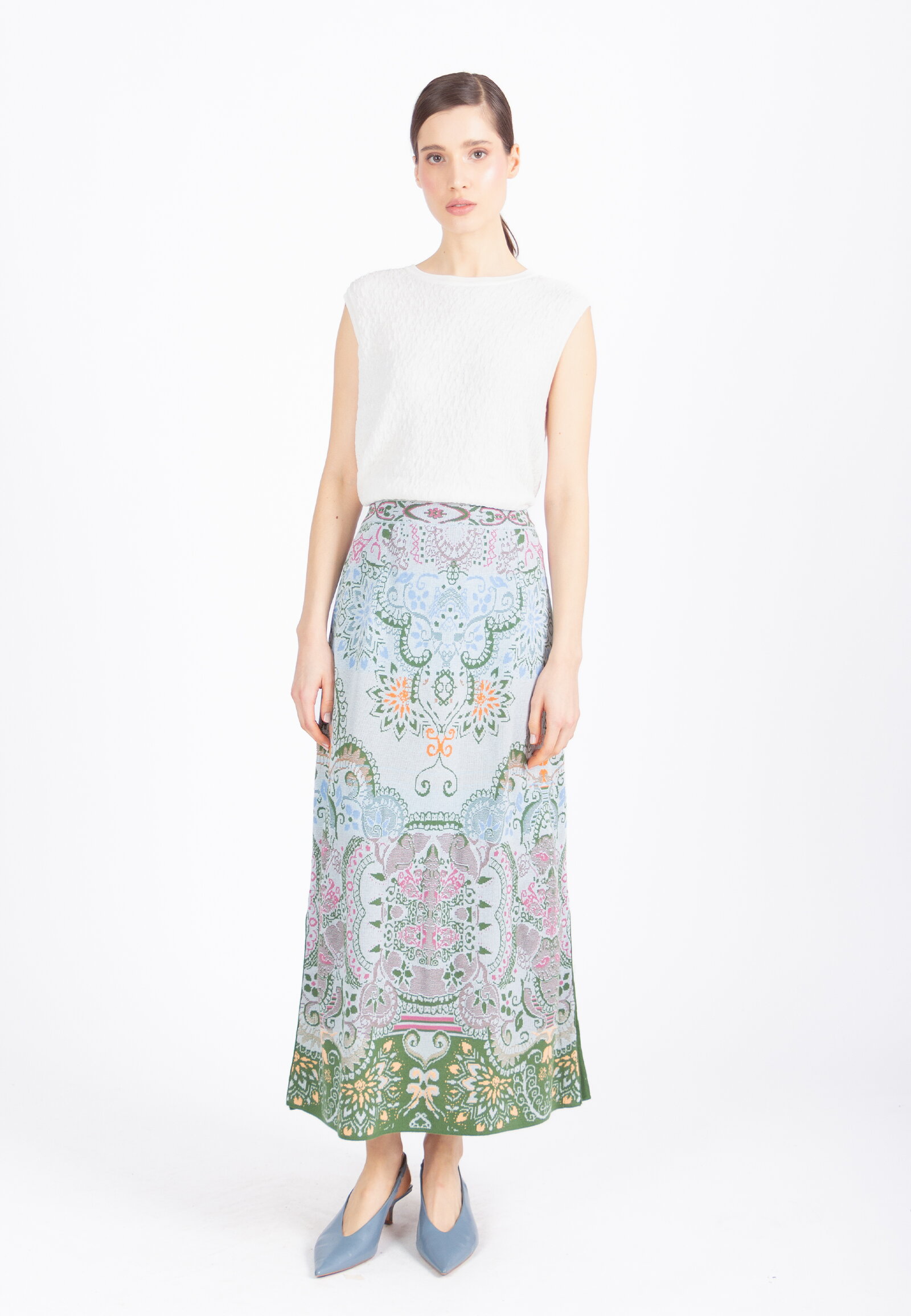 IVKO Woman suknja sa Mediteran motivom ispletena od pamuka prikazuje stilizovane obalne elemente u skladnom rasporedu. Ima jasno oblikovanu siluetu koja ostaje stabilna u pokretu.