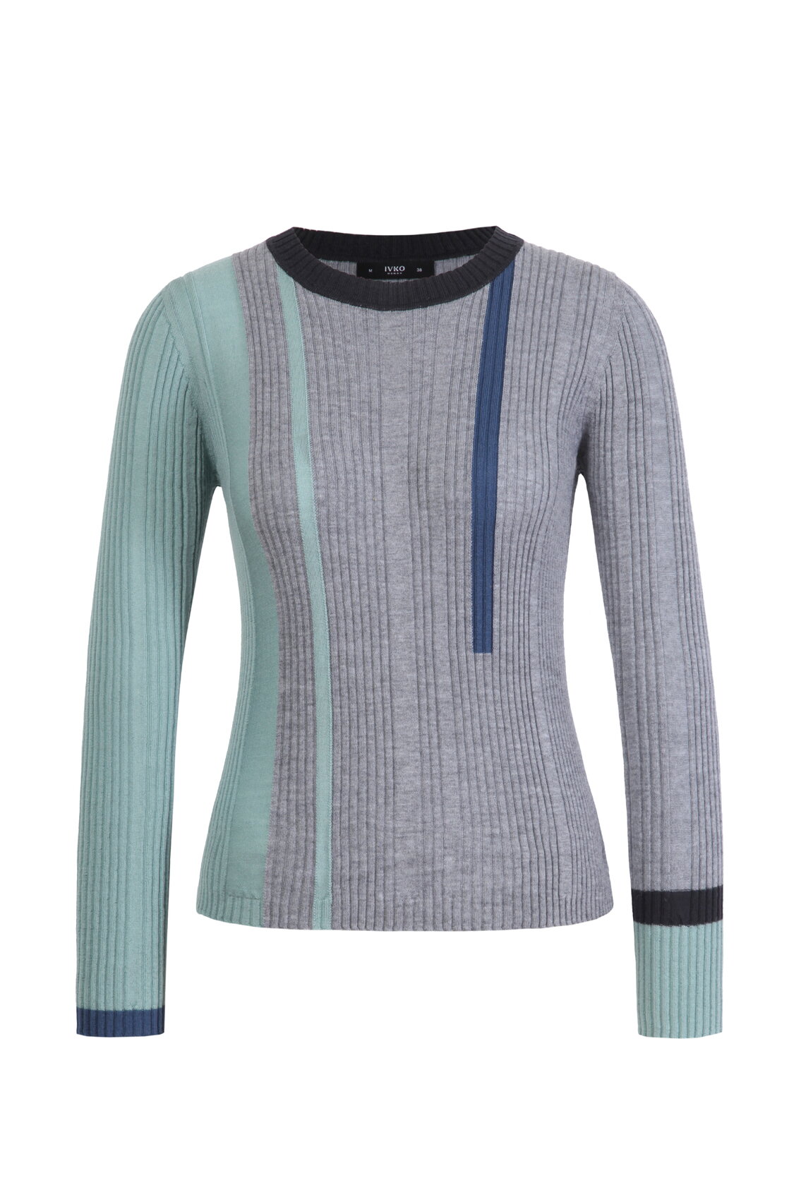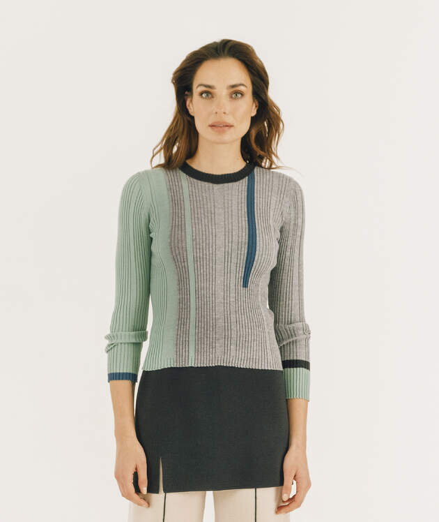 Pulover uže forme od 100% vune, rebrasto tkanje, sa dugim rukavima, okruglim izrezom i kontrastnim rubovima.