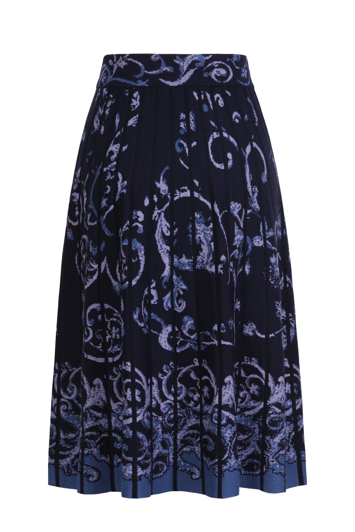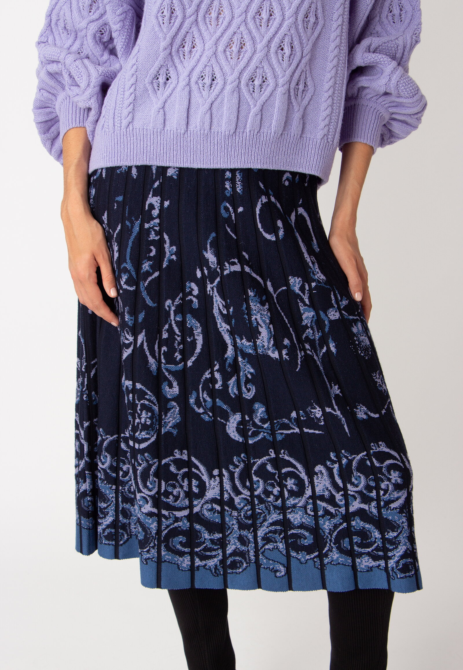 Žakardna midi suknja A-kroja ispletena od mešavine viskoze i vune sa naglašenim strukom.