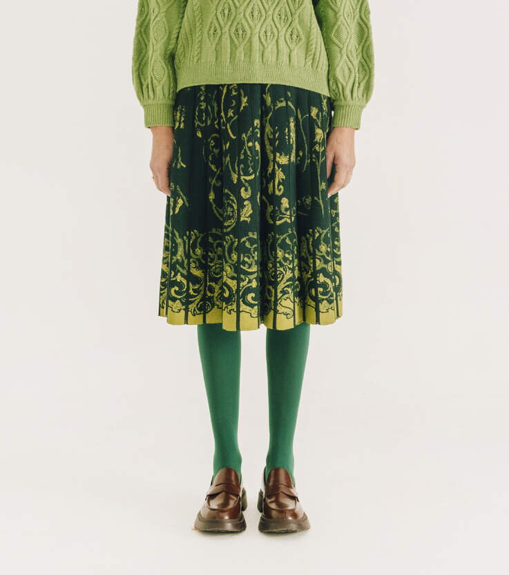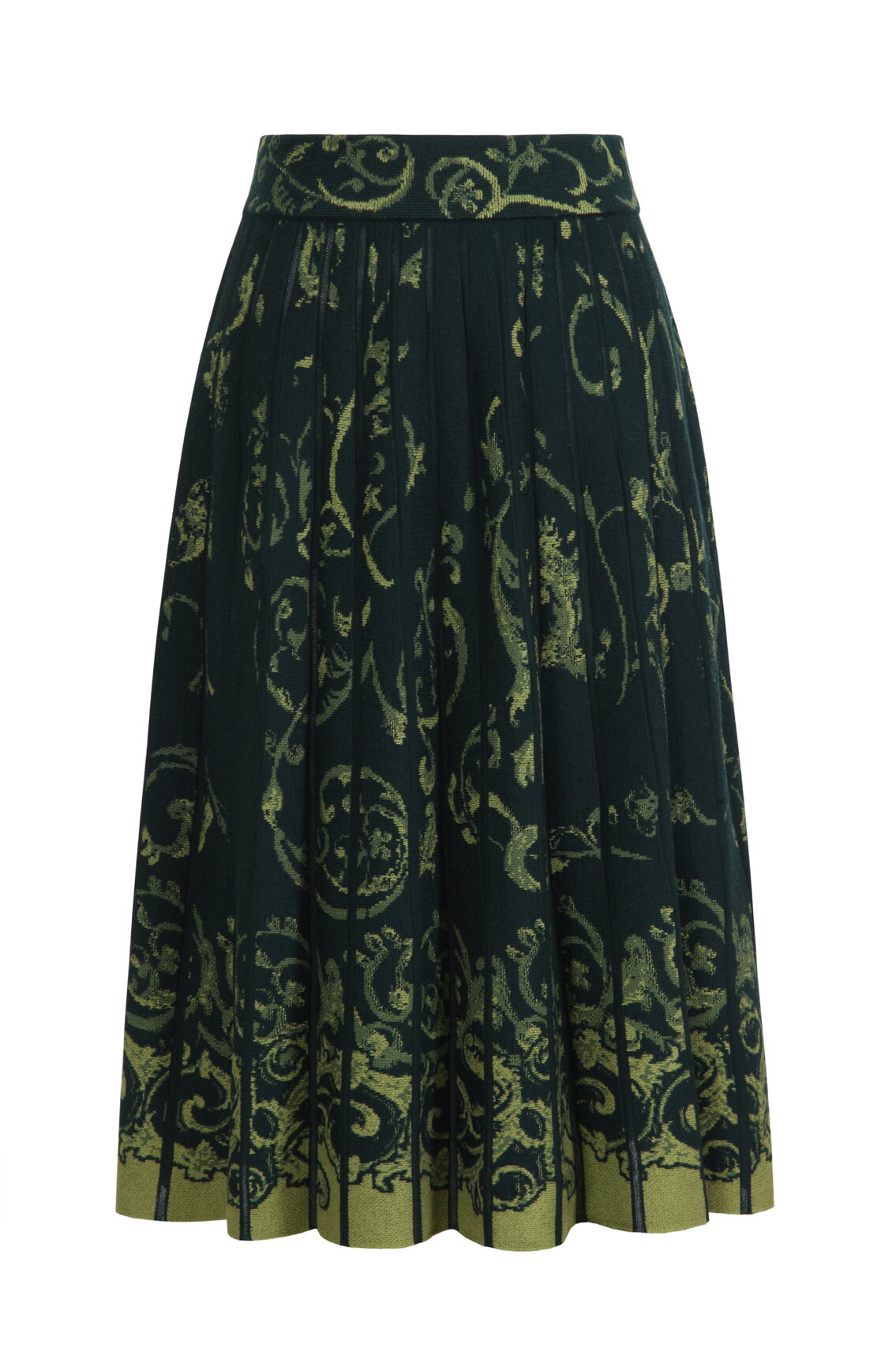 Žakardna midi suknja A-kroja ispletena od mešavine viskoze i vune sa naglašenim strukom.