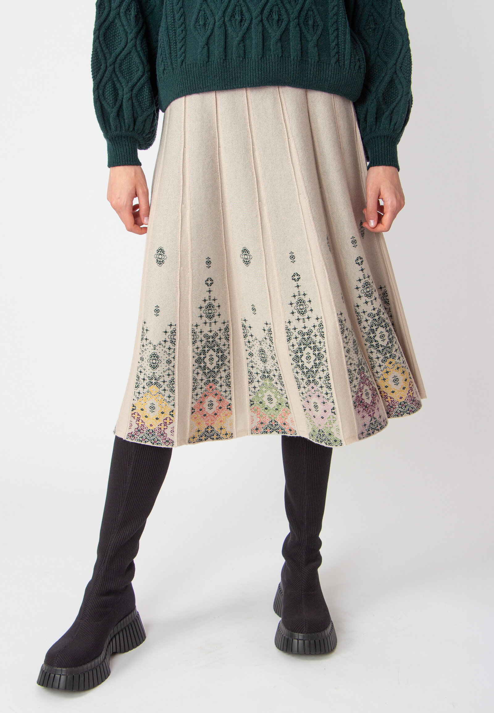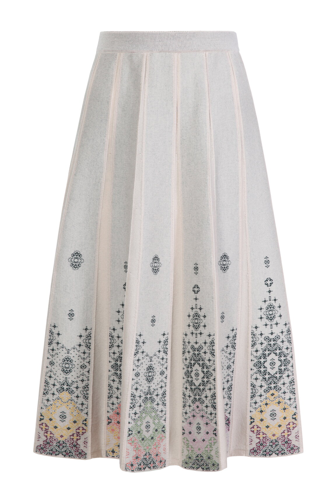Žakardna midi suknja A kroja od 100% vune sa širokim faltama i ornament uzorkom na njima.