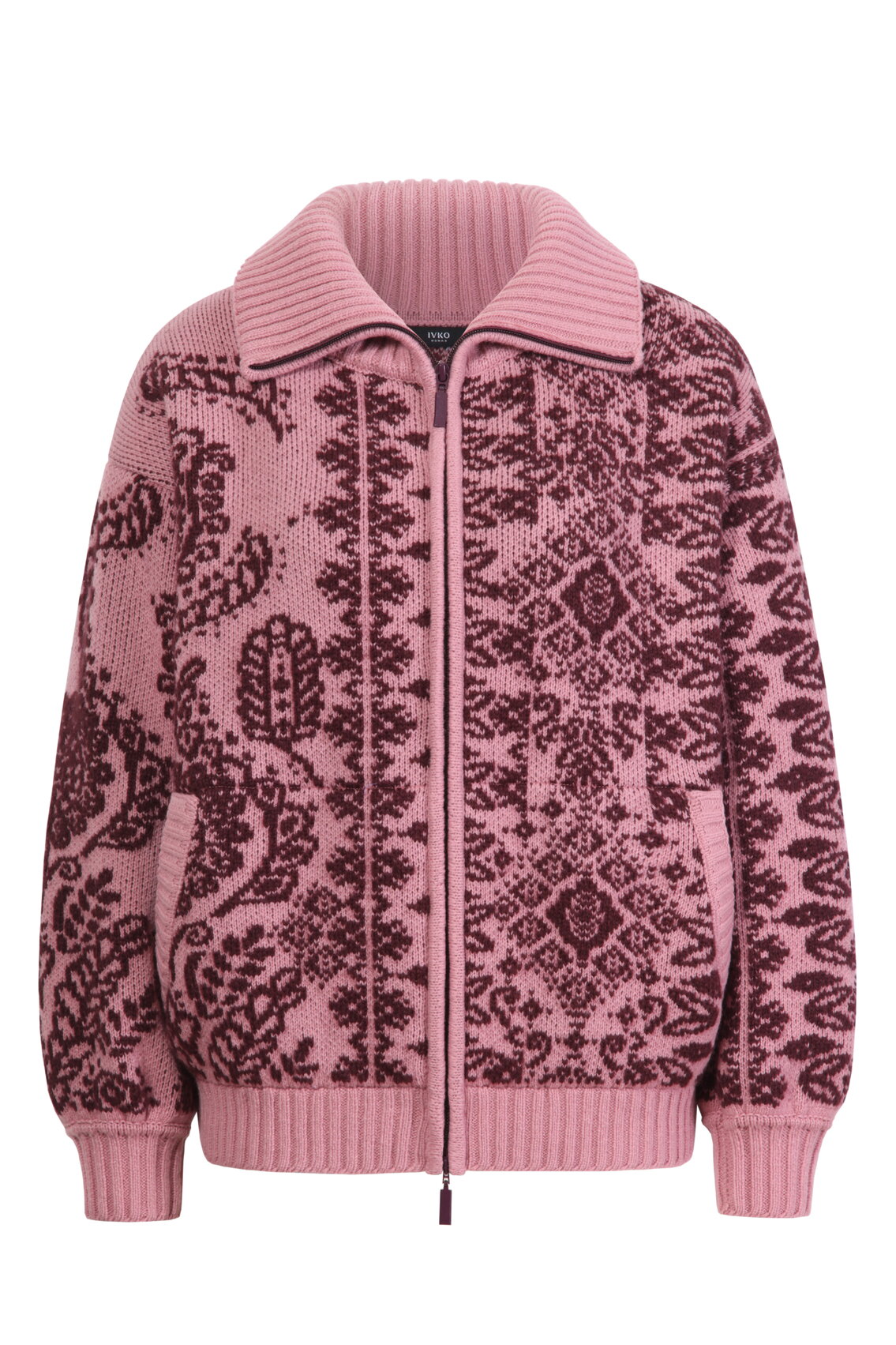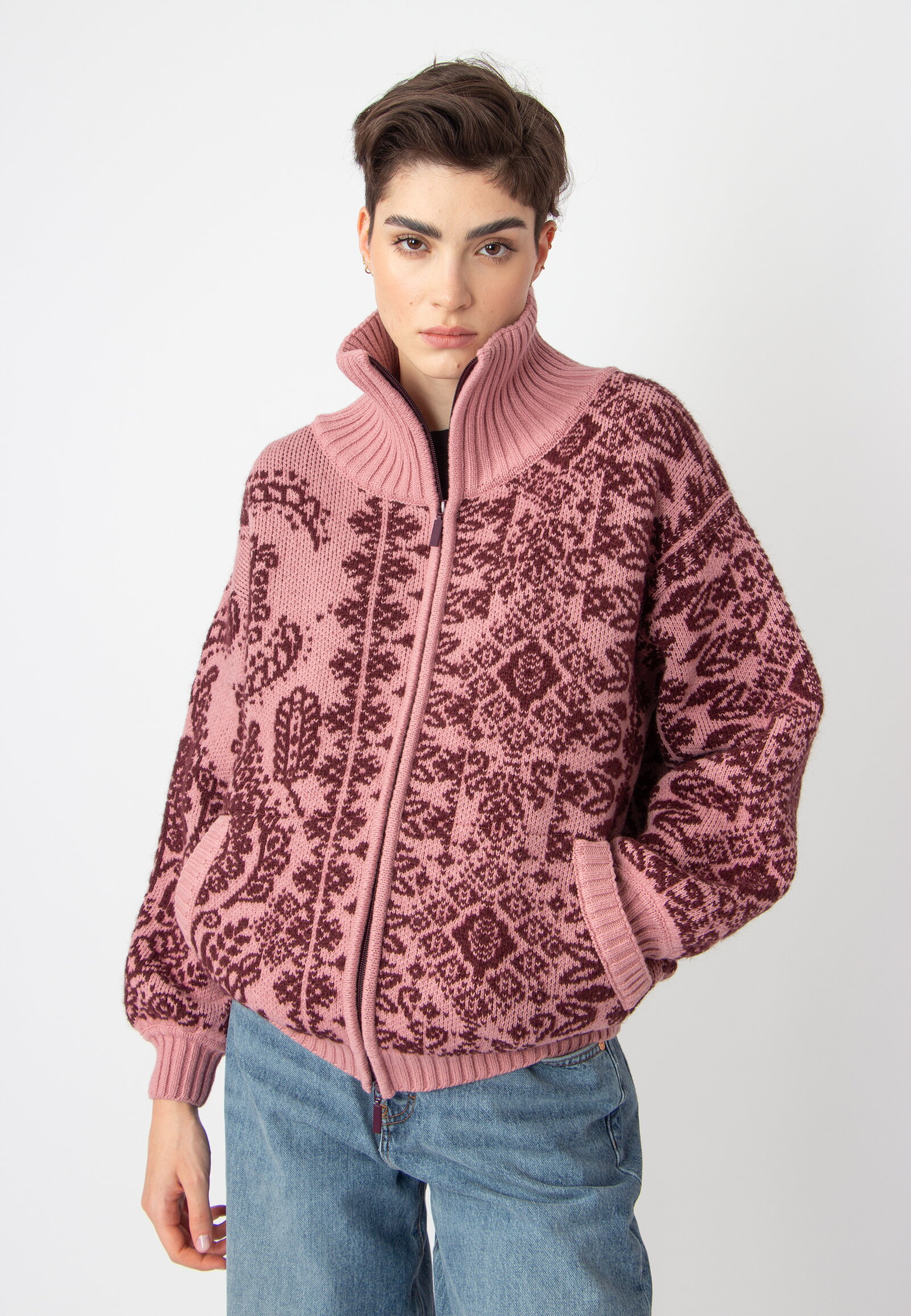 Ova jakna sa rol kragnom, ispletena od mešavine vune, ima ornament motiv, opušten kroj, prednji rajsferšlus, dva prednja džepa i rebraste porube.