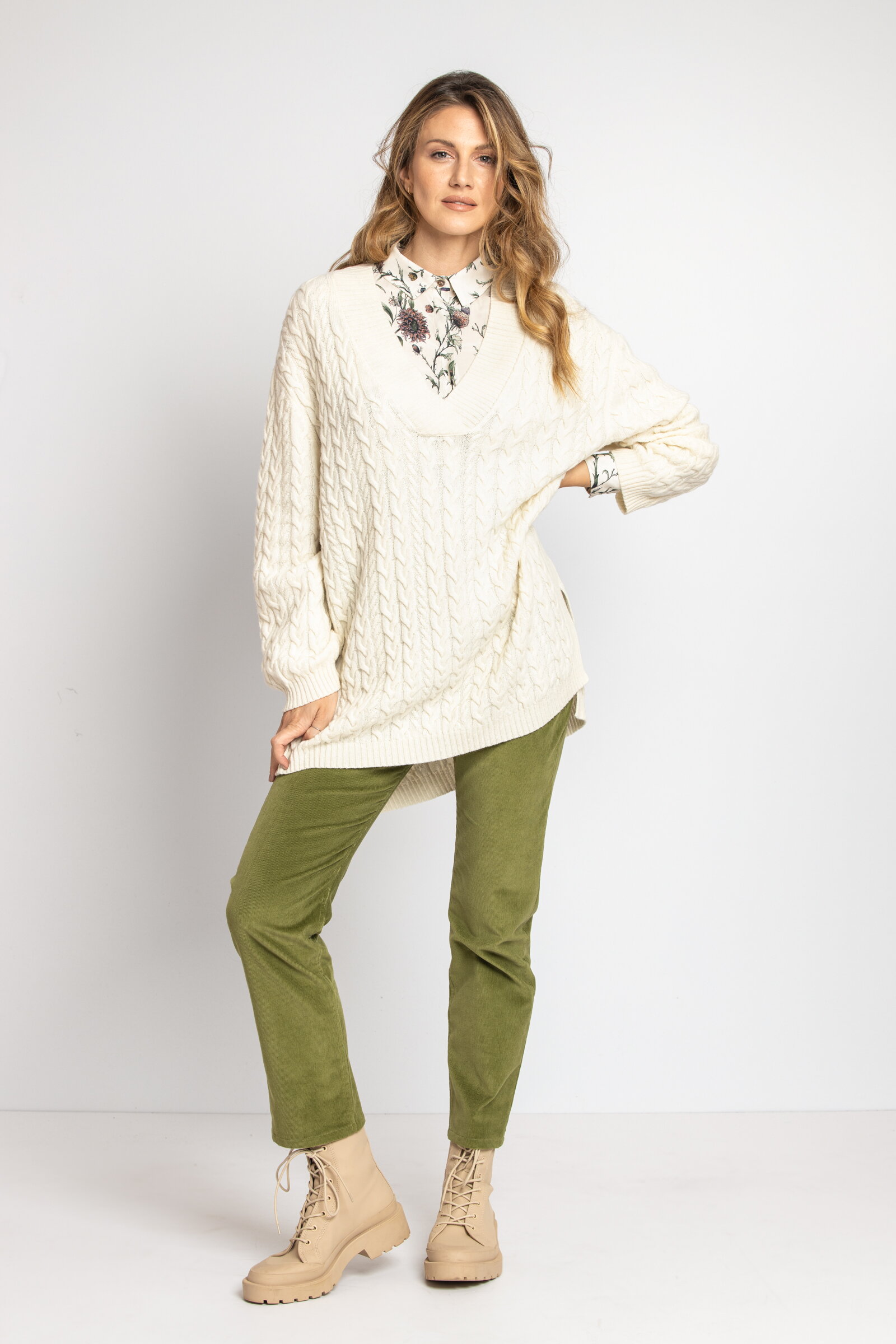Pulover predimenzioniranog kroja u osnovnim bojama sa interesantnim strukturiranim dizajnom i V izrezom je simbol udobne zime i idealan saveznik za topao i nežan osećaj, čak i tokom minusa.