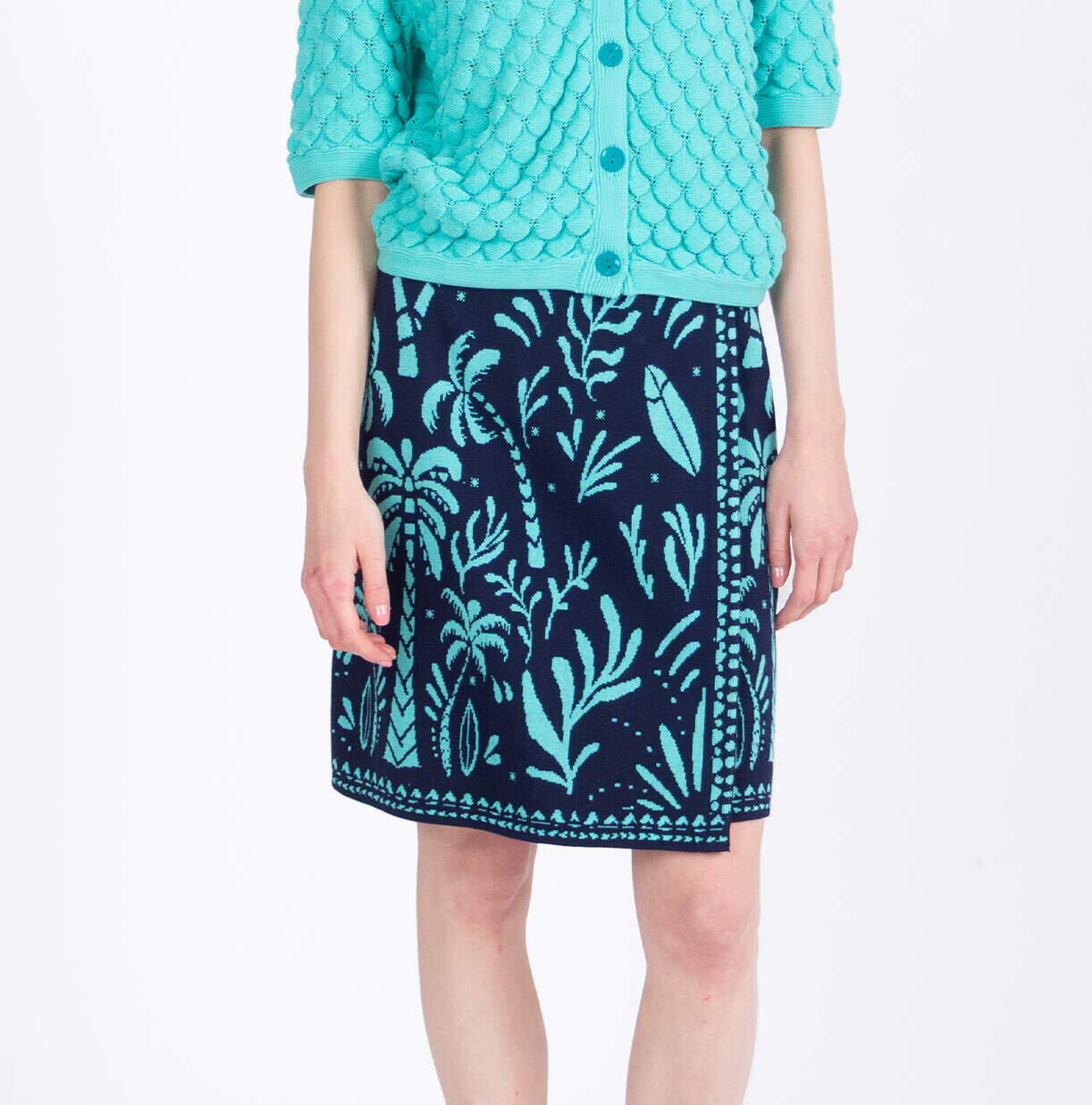 IVKO Woman žakard suknja na preklop sa Urban Botanik motivom ispletena od pamuka prikazuje stilizovane tropske forme. Ističe preklop koji daje dinamiku i jasno definisanu liniju.