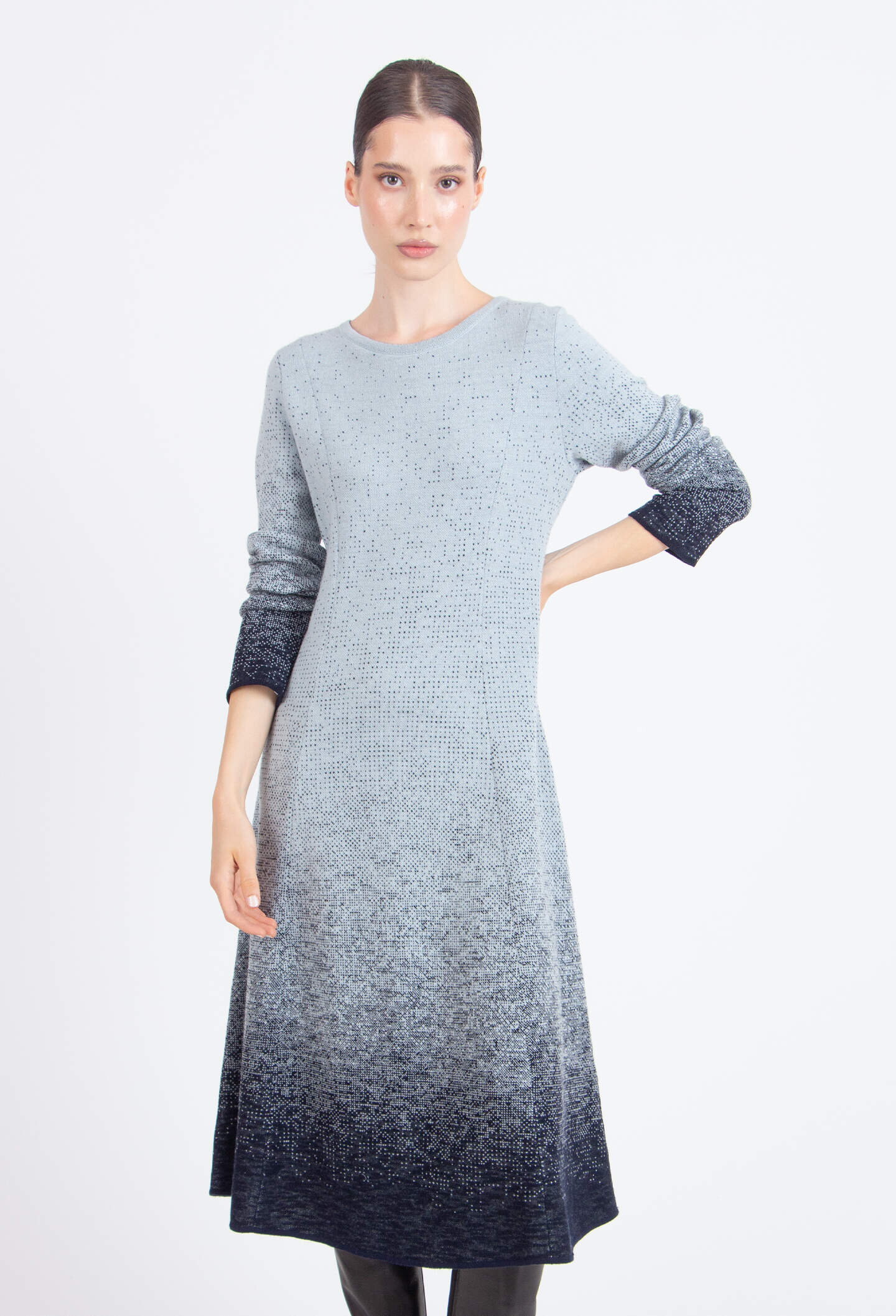 Duga haljina od vune sa Jato motivom. Čamac izrez uokviruje vrat, dok standardni kroj pruža udobnost i uredan izgled.